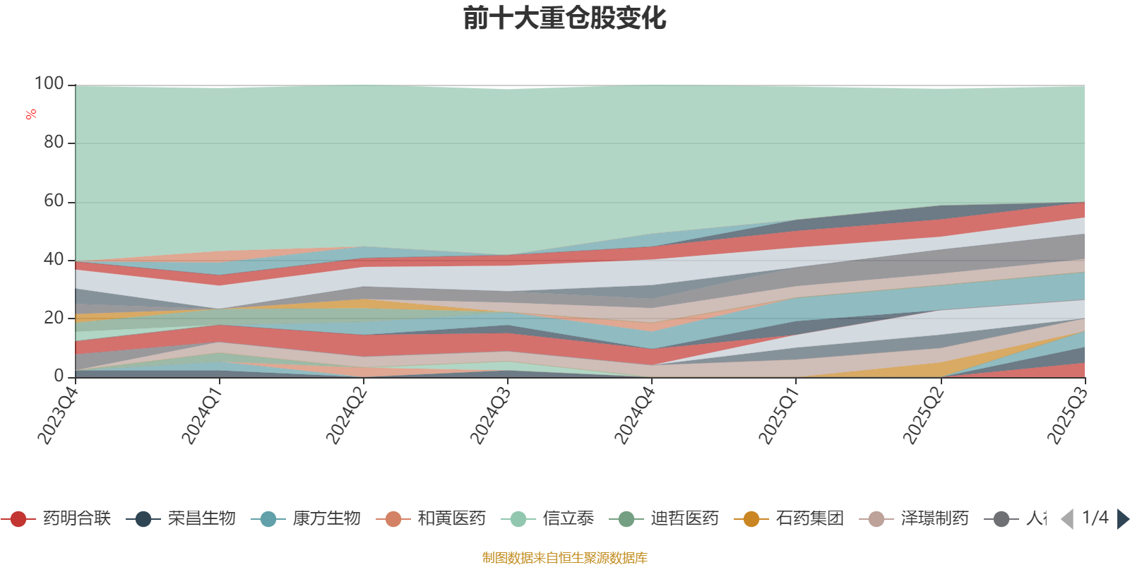 截至2025年三季度末,基金十大重仓股分别是科伦博泰生物-B、信达生物、三生制药、恒瑞医药、康方生物、荣昌生物、新诺威、药明合联、百利天恒、泽璟制药。