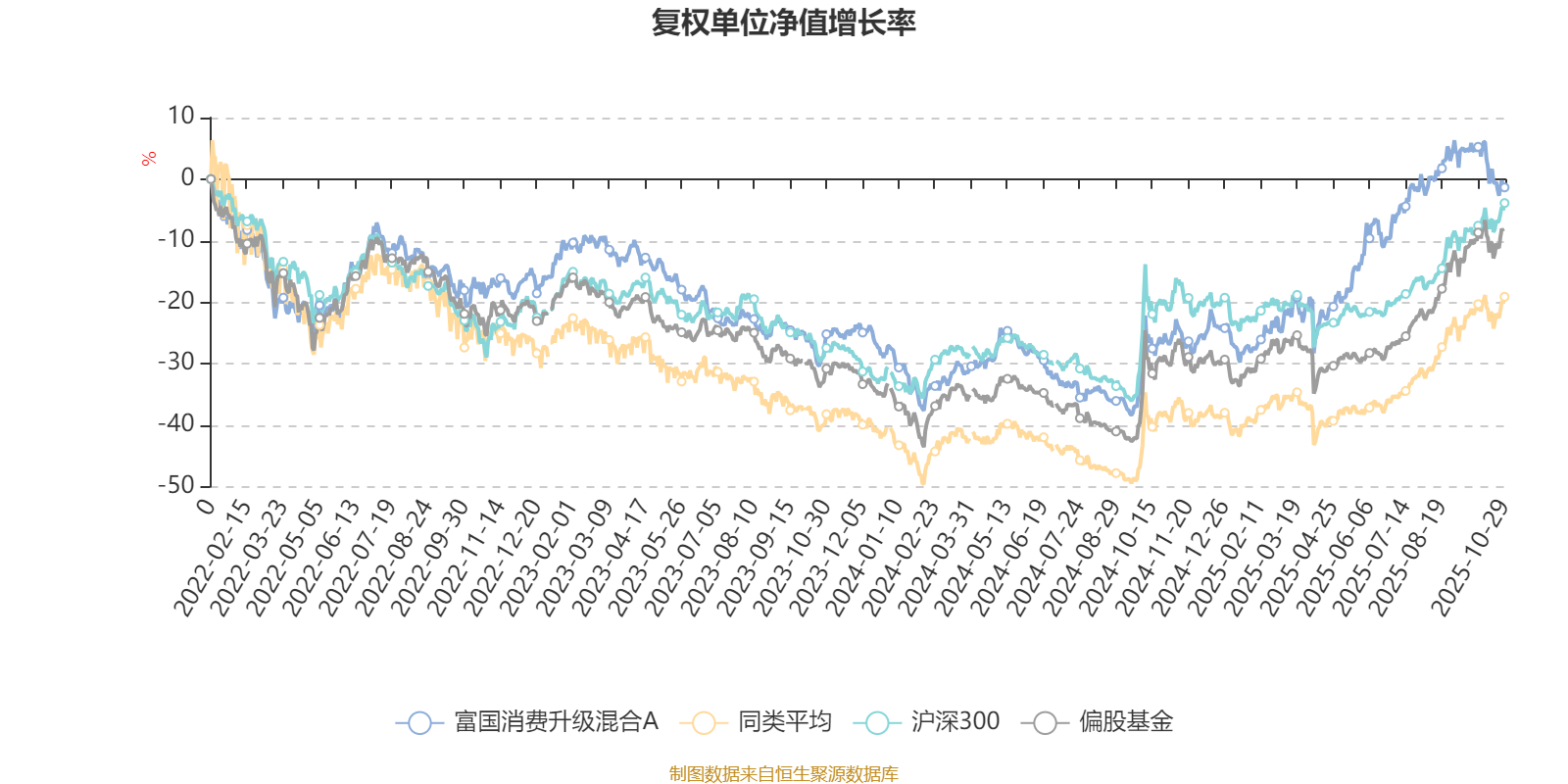 截至10月29日,富国消费升级混合A近三个月复权单位净值增长率为-2.12%,位于同类可比基金609/621;近半年复权单位净值增长率为21.69%,位于同类可比基金458/621;近一年复权单位净值增长率为33.48%,位于同类可比基金275/611;近三年复权单位净值增长率为22.32%,位于同类可比基金234/518。