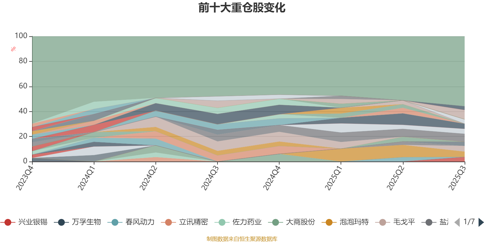 截至2025年三季度末,基金十大重仓股分别是阿里巴巴-W、腾讯控股、毛戈平、泡泡玛特、老铺黄金、贵州茅台、兴业银锡、信达生物、石头科技、快手-W。