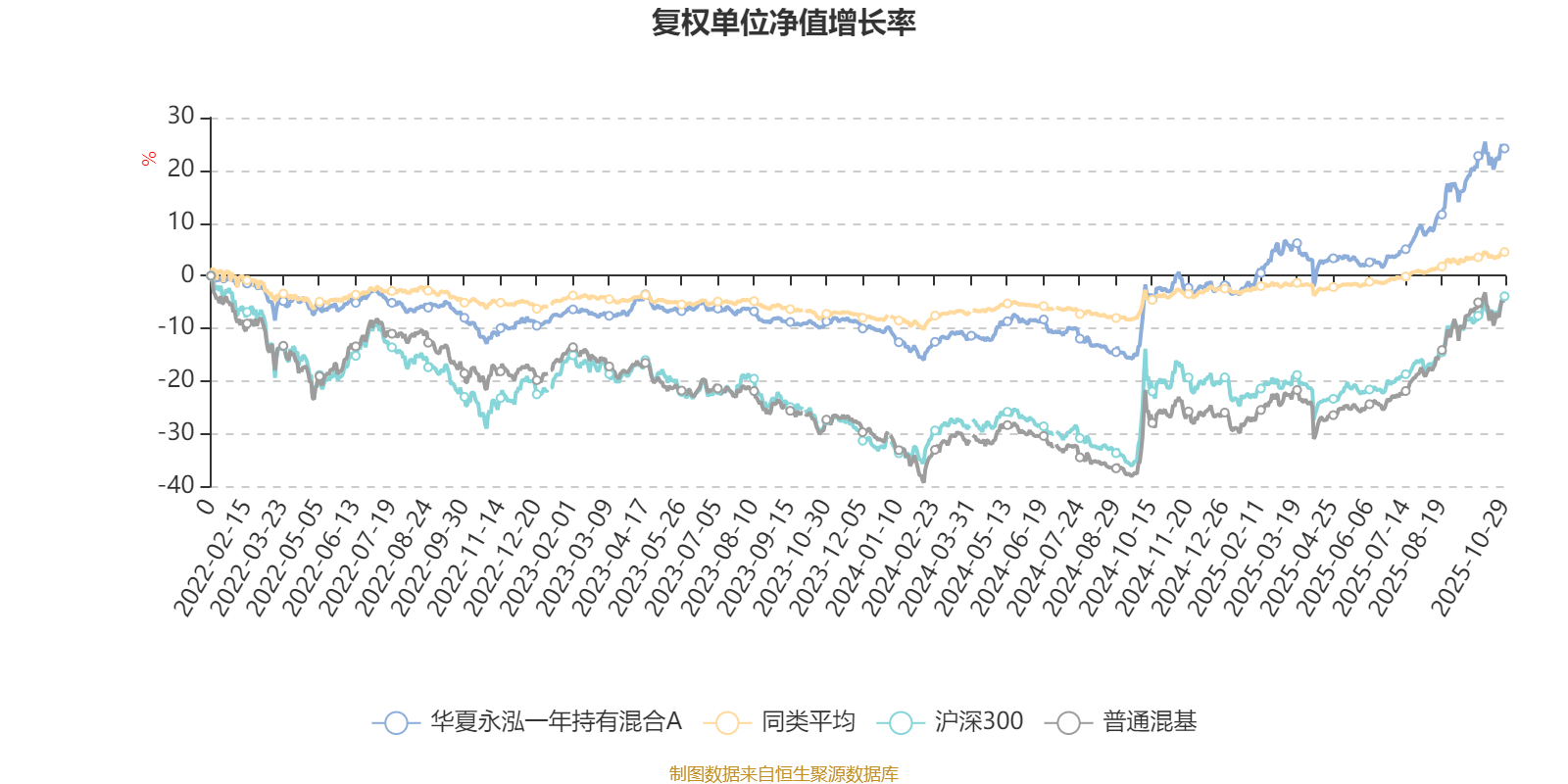 截至10月29日,华夏永泓一年持有混合A近三个月复权单位净值增长率为13.19%,位于同类可比基金9/629;近半年复权单位净值增长率为20.59%,位于同类可比基金13/629;近一年复权单位净值增长率为27.56%,位于同类可比基金9/623;近三年复权单位净值增长率为41.60%,位于同类可比基金3/557。