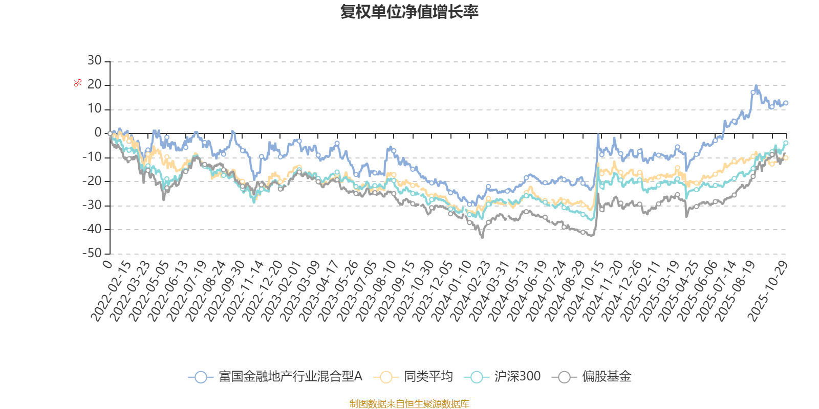 截至10月29日,富国金融地产行业混合型A近三个月复权单位净值增长率为3.21%,位于同类可比基金5/16;近半年复权单位净值增长率为23.16%,位于同类可比基金1/16;近一年复权单位净值增长率为21.67%,位于同类可比基金1/14;近三年复权单位净值增长率为35.29%,位于同类可比基金6/12。