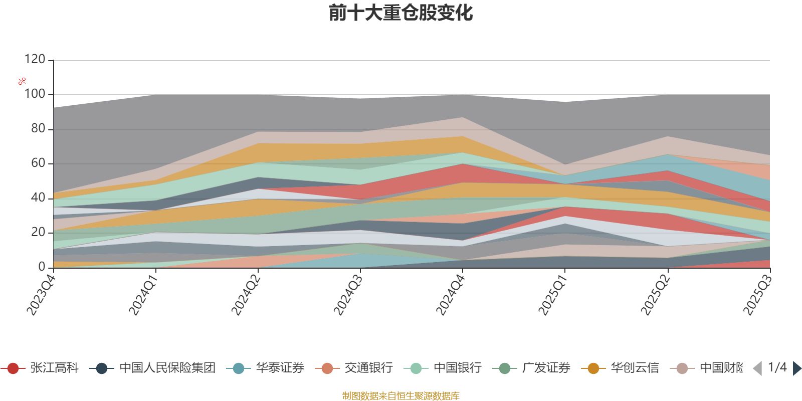 该基金持股集中度较高。截至2025年三季度末,基金重仓股分别是九方智投控股、衢州发展、中国人民保险集团、同花顺、杭州银行、江苏银行、成都银行、张江高科、指南针、广发证券。