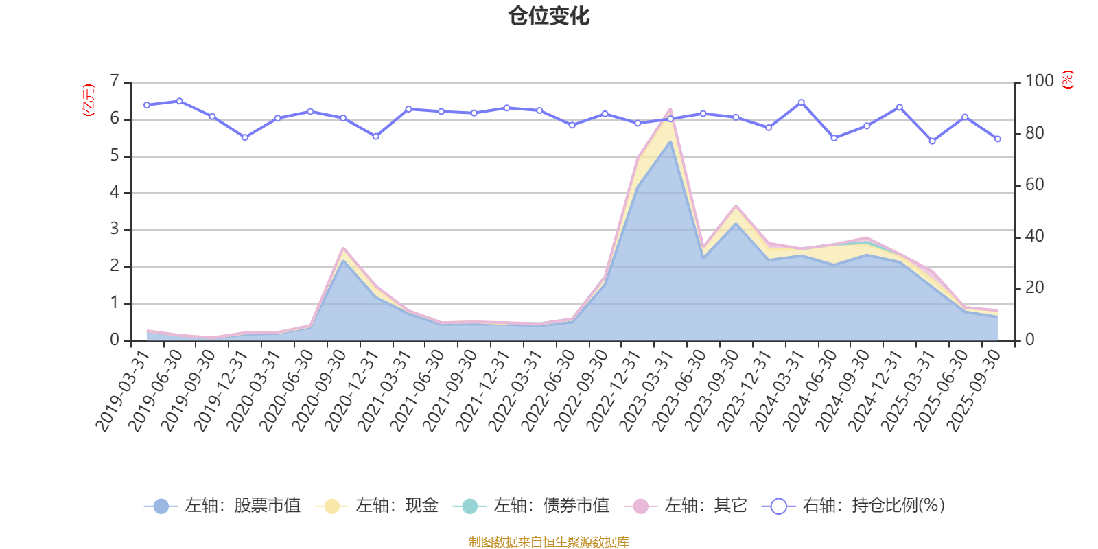 据定期报告数据统计,近三年平均股票仓位为84.43%,同类平均为87.15%。2019年上半年末基金达到92.76%的最高仓位,2025年一季度末最低,为77.26%。