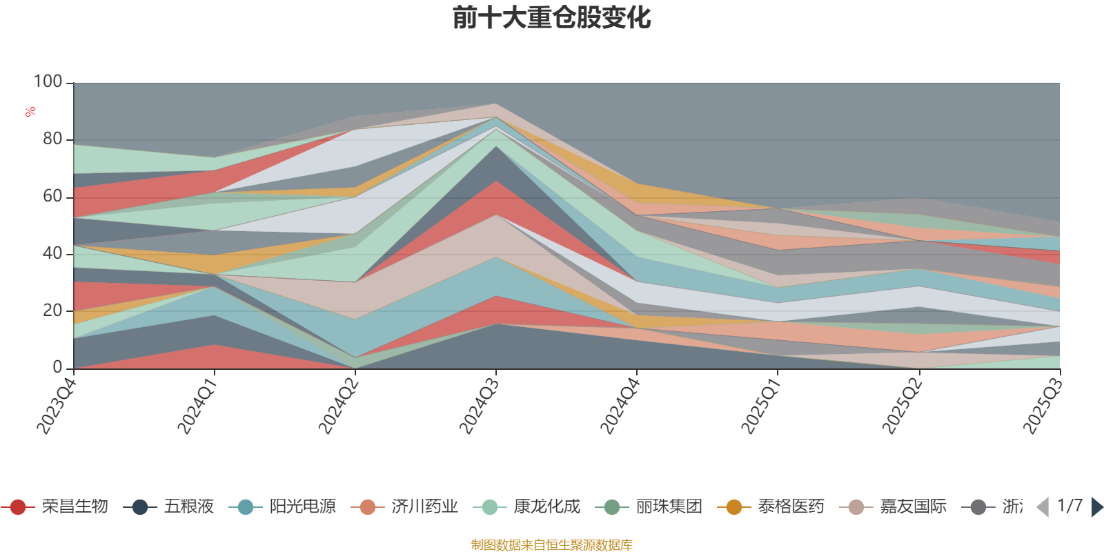 该基金持股集中度较高。截至2025年三季度末,基金十大重仓股分别是药明康德、海澜之家、石头科技、人福医药、盐津铺子、中国太保、韵达股份、联影医疗、康龙化成、新乳业。
