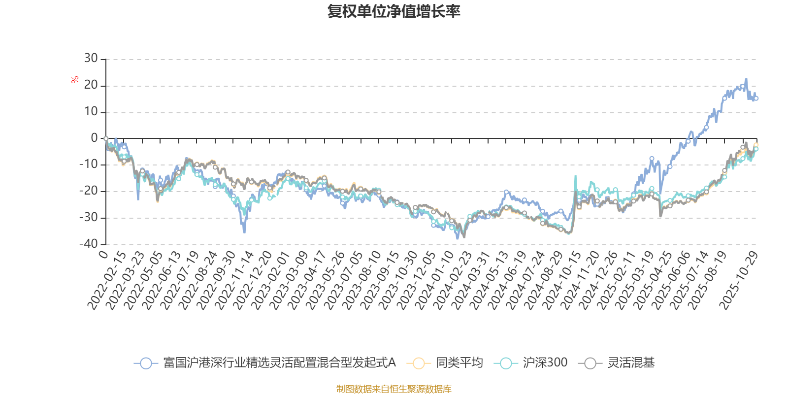 截至10月29日,富国沪港深行业精选灵活配置混合型发起式A近三个月复权单位净值增长率为3.37%,位于同类可比基金1014/1287;近半年复权单位净值增长率为25.42%,位于同类可比基金632/1287;近一年复权单位净值增长率为47.61%,位于同类可比基金210/1287;近三年复权单位净值增长率为77.44%,位于同类可比基金57/1286。