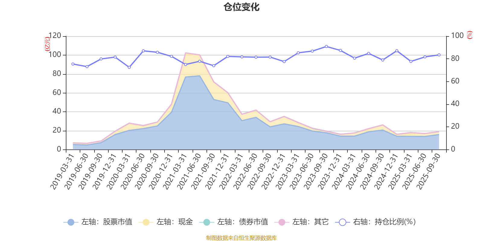 据定期报告数据统计,近三年平均股票仓位为83.54%,同类平均为72.35%。2023年三季度末基金达到90.88%的最高仓位,2020年一季度末最低,为72.51%。