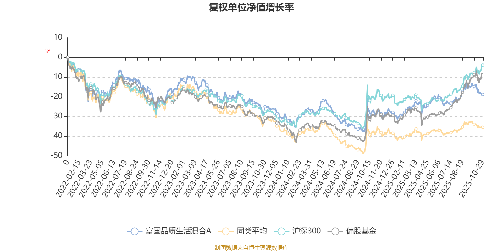 截至10月29日,富国品质生活混合A近三个月复权单位净值增长率为1.36%,位于同类可比基金44/85;近半年复权单位净值增长率为6.24%,位于同类可比基金34/85;近一年复权单位净值增长率为12.40%,位于同类可比基金25/82;近三年复权单位净值增长率为11.05%,位于同类可比基金22/74。