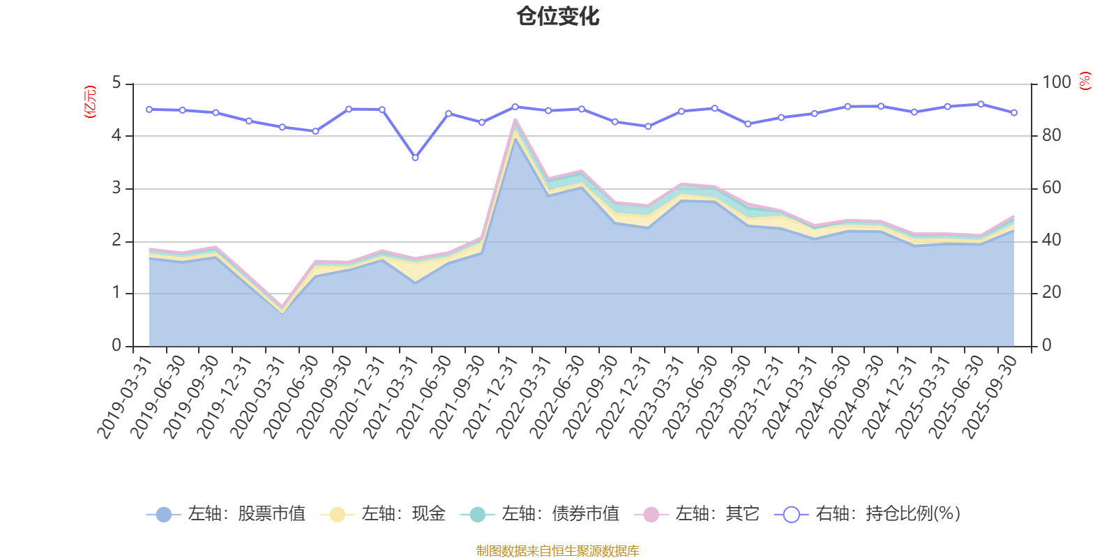 据定期报告数据统计,近三年平均股票仓位为89.06%,同类平均为85.66%。2025年上半年末基金达到92.22%的最高仓位,2021年一季度末最低,为71.85%。