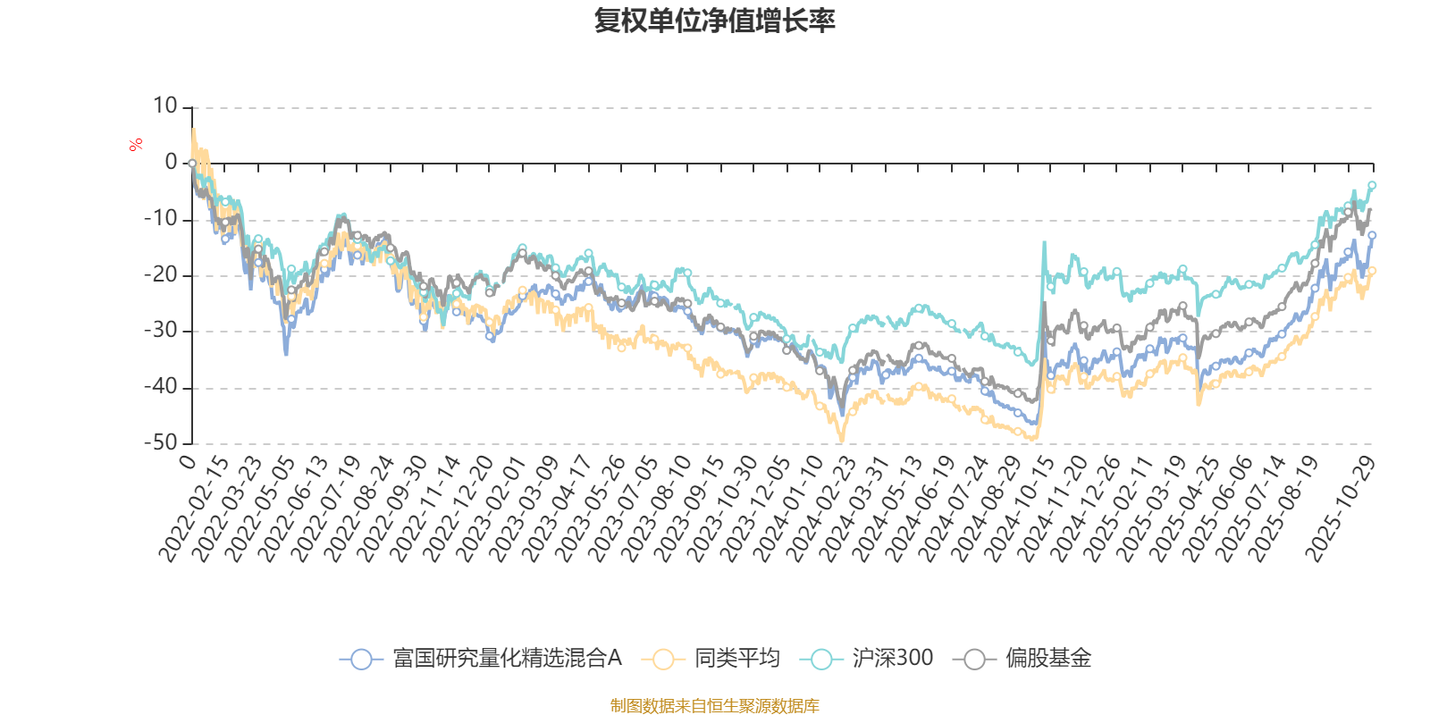 截至10月29日,富国研究量化精选混合A近三个月复权单位净值增长率为18.90%,位于同类可比基金217/621;近半年复权单位净值增长率为36.79%,位于同类可比基金204/621;近一年复权单位净值增长率为35.91%,位于同类可比基金245/611;近三年复权单位净值增长率为21.58%,位于同类可比基金245/518。