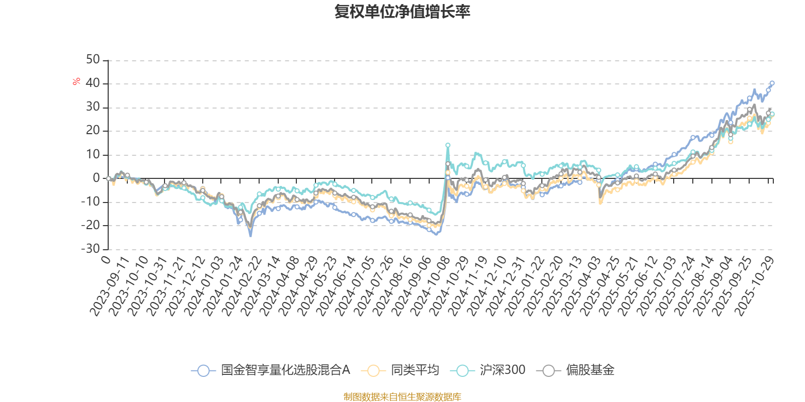 截至10月29日,国金智享量化选股混合A近三个月复权单位净值增长率为19.10%,位于同类可比基金214/621;近半年复权单位净值增长率为41.79%,位于同类可比基金150/621;近一年复权单位净值增长率为50.35%,位于同类可比基金123/611。