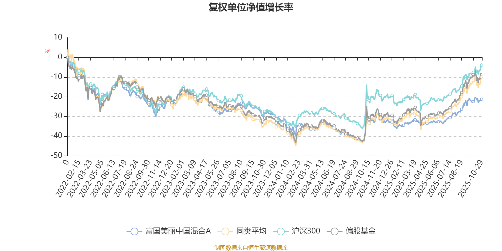 截至10月29日,富国美丽中国混合A近三个月复权单位净值增长率为9.71%,位于同类可比基金195/265;近半年复权单位净值增长率为18.93%,位于同类可比基金213/265;近一年复权单位净值增长率为16.34%,位于同类可比基金216/265;近三年复权单位净值增长率为12.36%,位于同类可比基金164/253。