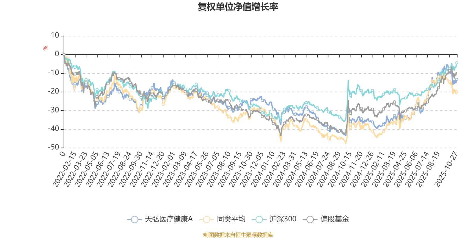 截至10月27日,天弘医疗健康A近三个月复权单位净值增长率为5.26%,位于同类可比基金11/106;近半年复权单位净值增长率为31.81%,位于同类可比基金18/104;近一年复权单位净值增长率为33.43%,位于同类可比基金39/101;近三年复权单位净值增长率为9.20%,位于同类可比基金33/75。