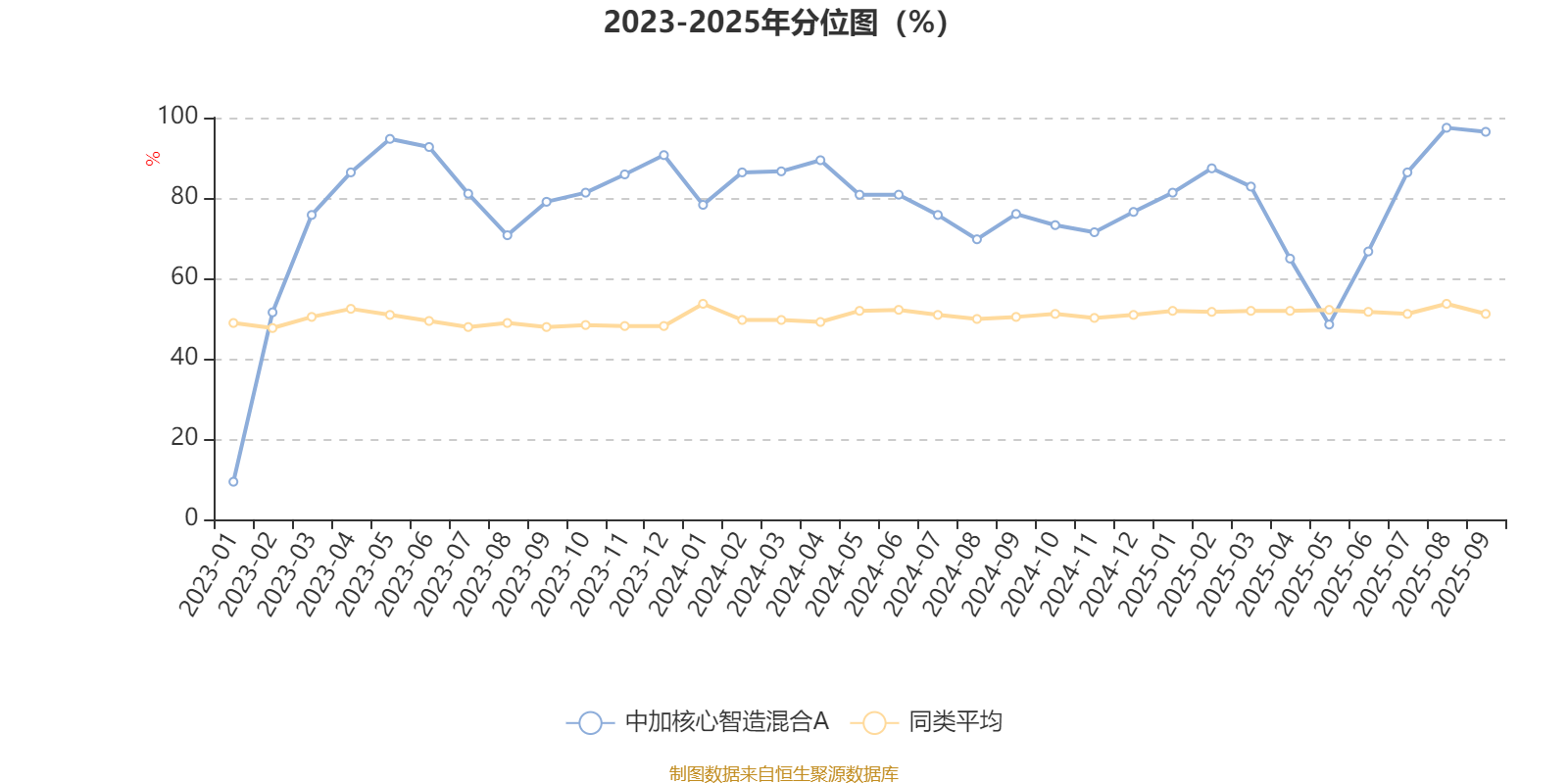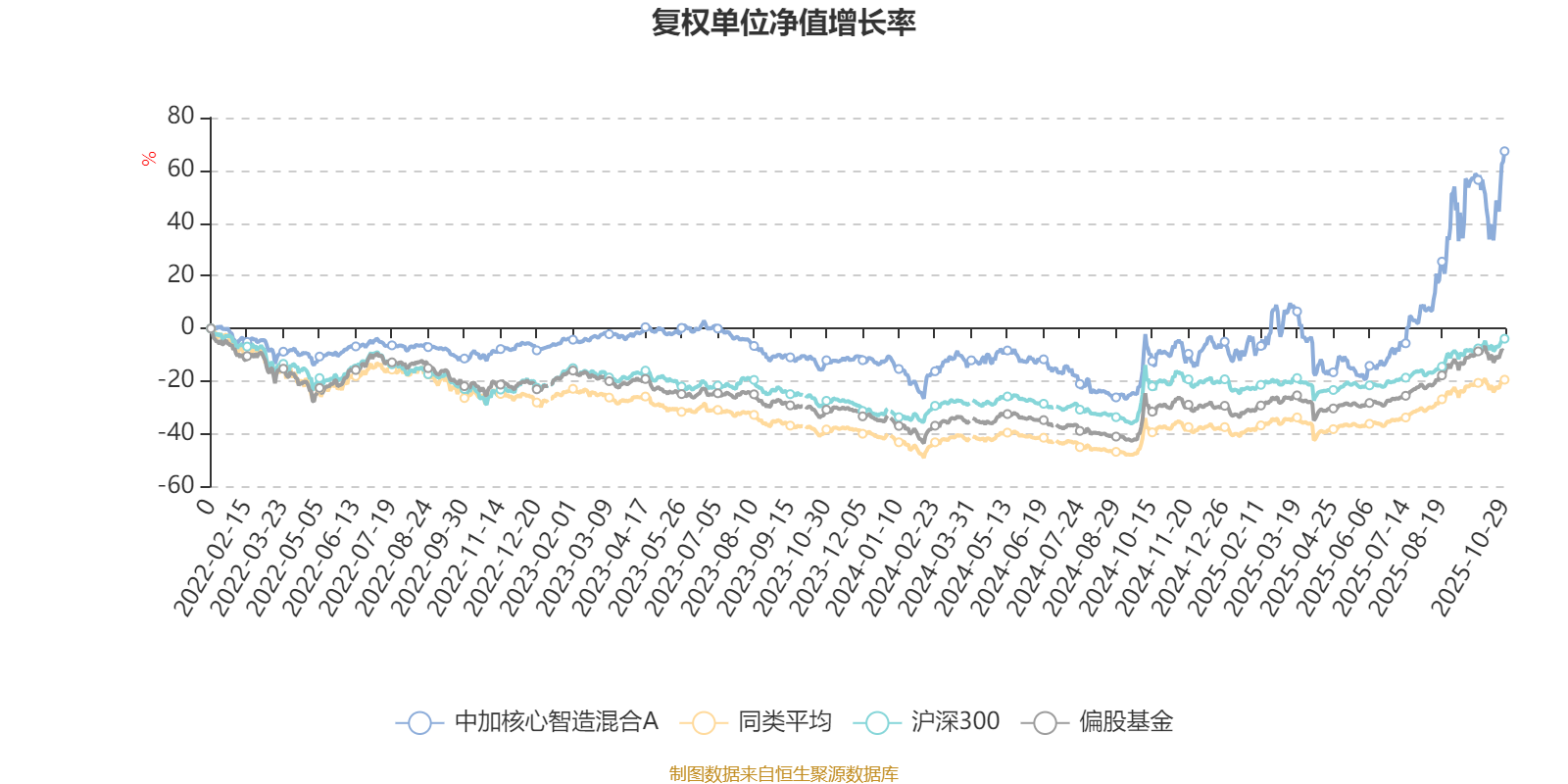 截至10月29日,中加核心智造混合A近三个月复权单位净值增长率为53.50%,位于同类可比基金11/689;近半年复权单位净值增长率为98.59%,位于同类可比基金11/688;近一年复权单位净值增长率为84.61%,位于同类可比基金17/657;近三年复权单位净值增长率为88.81%,位于同类可比基金6/364。