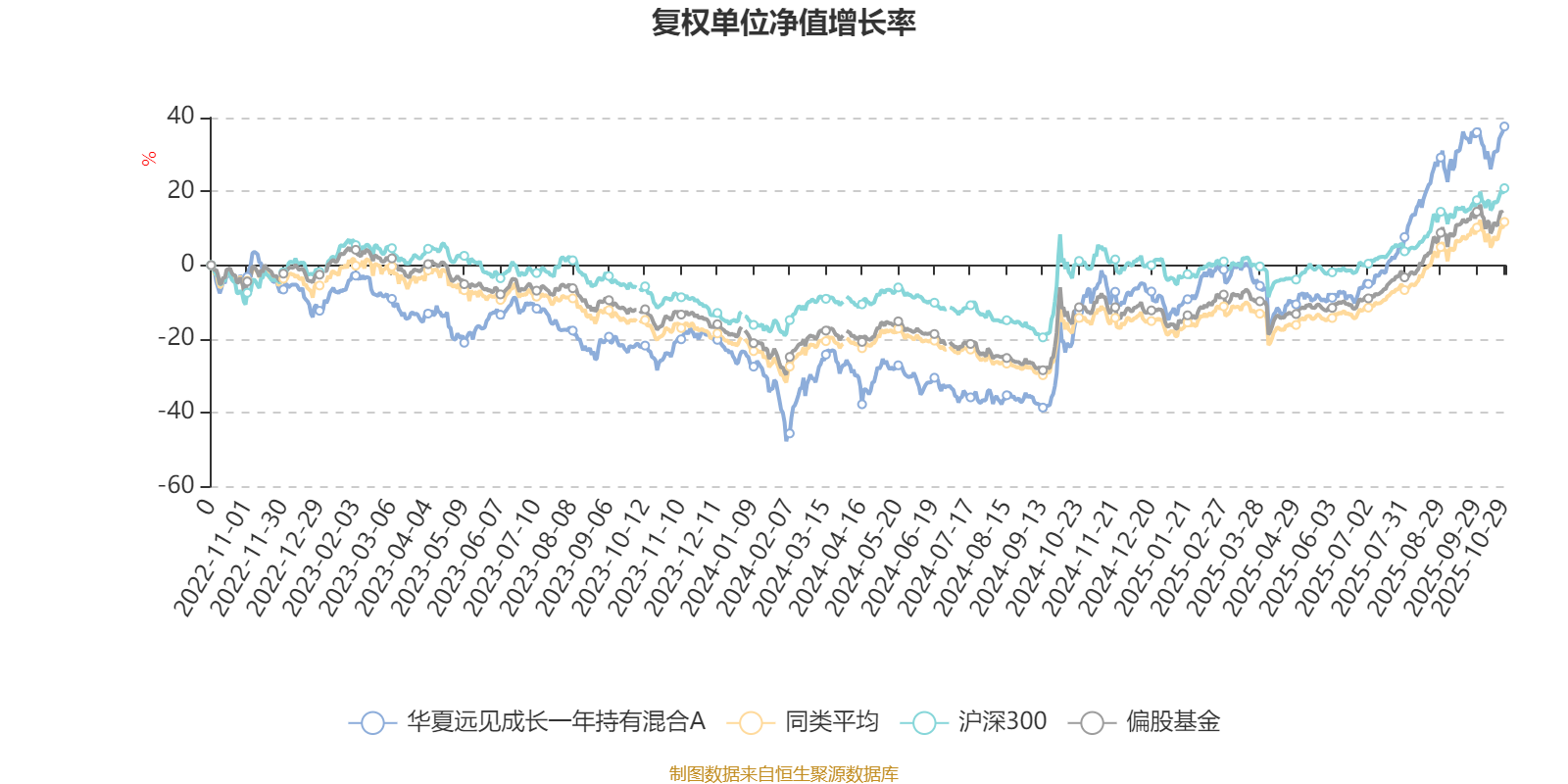 截至10月29日,华夏远见成长一年持有混合A近三个月复权单位净值增长率为30.31%,位于同类可比基金36/265;近半年复权单位净值增长率为53.94%,位于同类可比基金36/265;近一年复权单位净值增长率为50.68%,位于同类可比基金45/265;近三年复权单位净值增长率为47.08%,位于同类可比基金40/253。