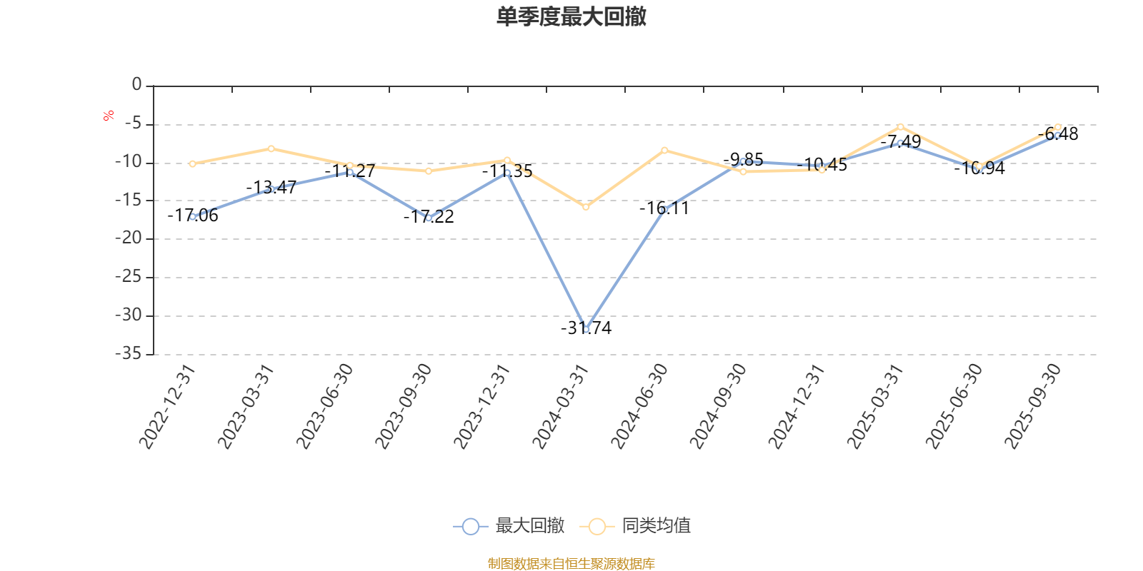 截至10月29日,基金近三年最大回撤为49.55%,同类可比基金排名236/251。单季度最大回撤出现在2024年一季度,为31.74%。