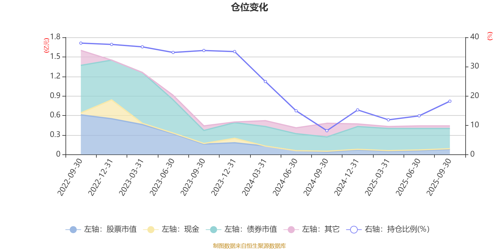 据定期报告数据统计,近三年平均股票仓位为23.87%,同类平均为19.14%。2022年三季度末基金达到38.03%的最高仓位,2024年三季度末最低,为8.15%。