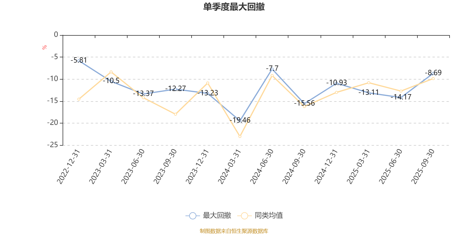 截至10月29日,基金近三年最大回撤为42.64%,同类可比基金排名72/159。单季度最大回撤出现在2024年一季度,为19.46%。