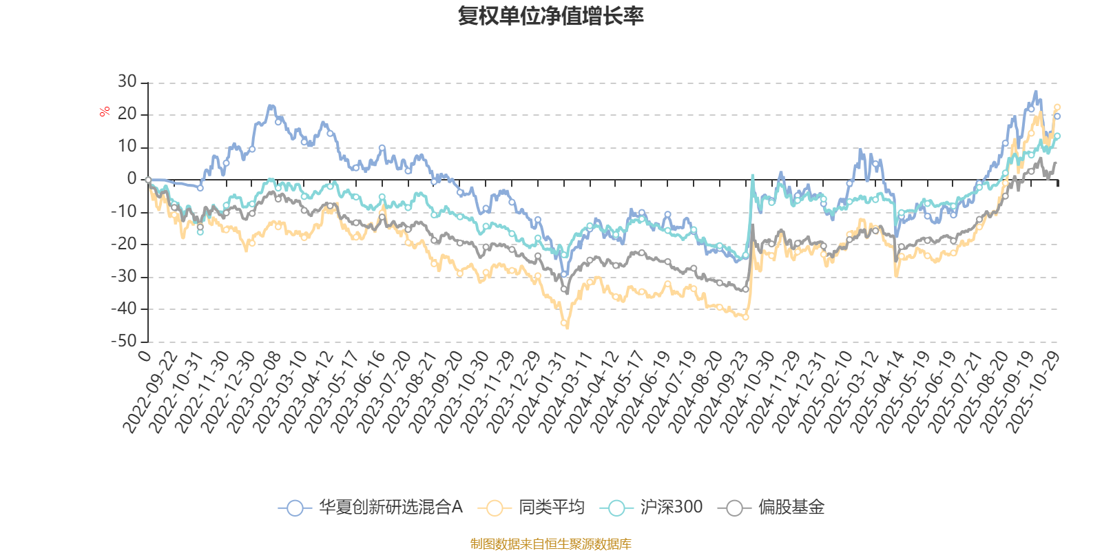 截至10月29日,华夏创新研选混合A近三个月复权单位净值增长率为18.01%,位于同类可比基金184/229;近半年复权单位净值增长率为34.72%,位于同类可比基金182/229;近一年复权单位净值增长率为26.86%,位于同类可比基金202/213;近三年复权单位净值增长率为23.47%,位于同类可比基金123/158。