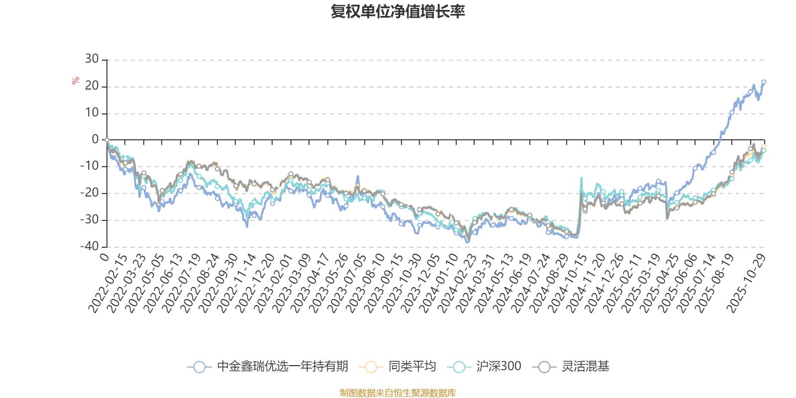 截至10月29日,中金鑫瑞优选一年持有期近三个月复权单位净值增长率为17.89%,位于同类可比基金435/1287;近半年复权单位净值增长率为52.16%,位于同类可比基金170/1287;近一年复权单位净值增长率为59.97%,位于同类可比基金110/1287;近三年复权单位净值增长率为77.59%,位于同类可比基金57/1286。