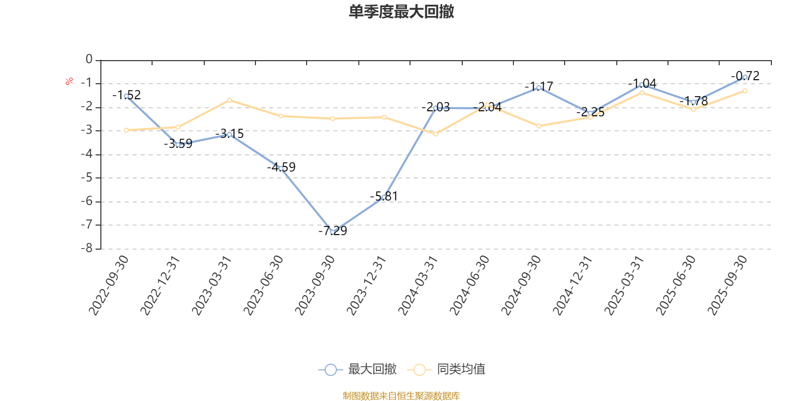截至10月28日,基金近三年最大回撤为15.82%,同类可比基金排名495/535。单季度最大回撤出现在2023年三季度,为7.29%。