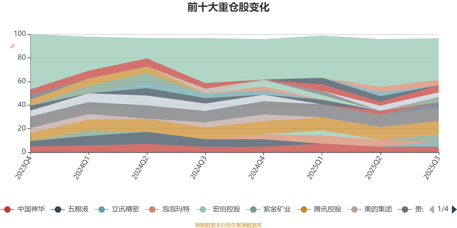 该基金持股集中度较高。截至2025年三季度末,基金十大重仓股分别是腾讯控股、贵州茅台、山西汾酒、紫金矿业、招金矿业、中国神华、中国宏桥、立讯精密、华通线缆、泸州老窖。
