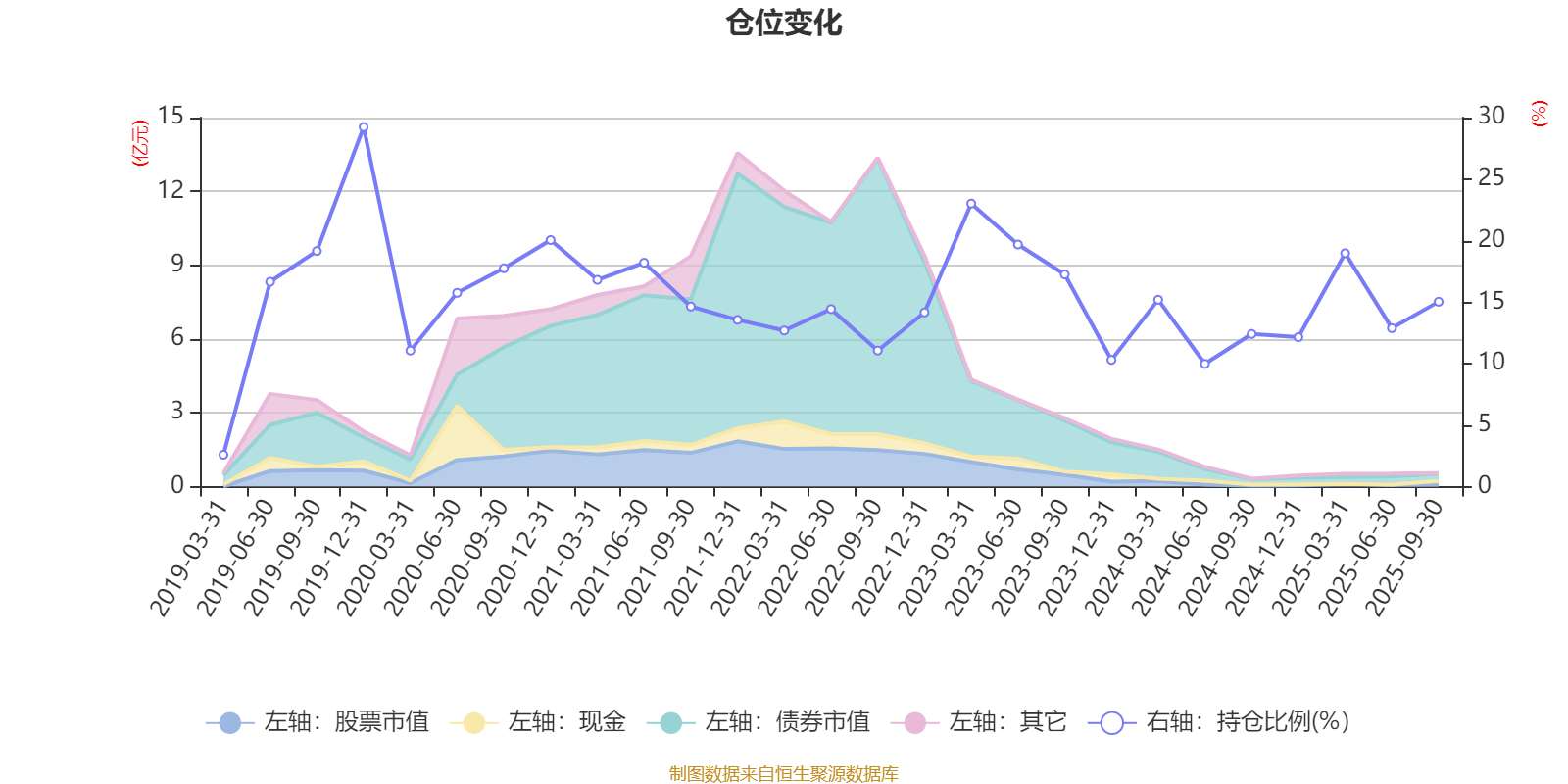 据定期报告数据统计,近三年平均股票仓位为15.08%,同类平均为19.14%。2019年末基金达到29.23%的最高仓位,2019年一季度末最低,为2.59%。