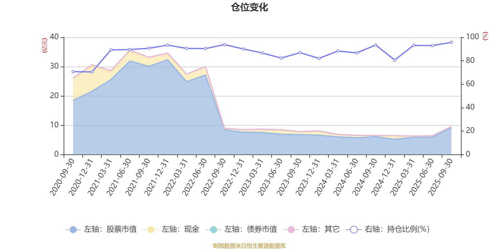 据定期报告数据统计,近三年平均股票仓位为88.26%,同类平均为85.99%。2025年三季度末基金达到95.78%的最高仓位,2020年末最低,为70.5%。