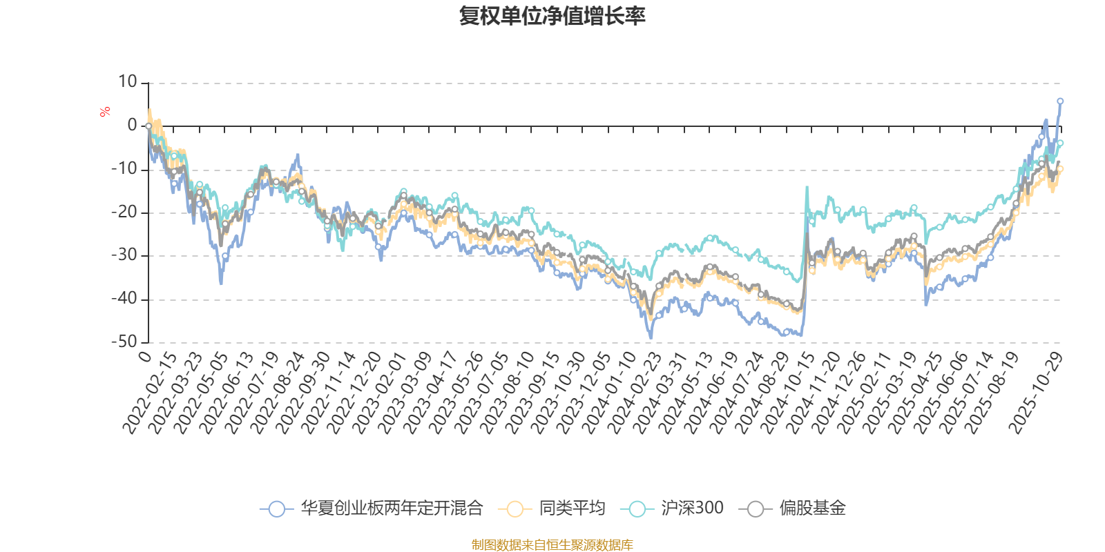 截至10月29日,华夏创业板两年定开混合近三个月复权单位净值增长率为39.09%,位于同类可比基金15/265;近半年复权单位净值增长率为70.29%,位于同类可比基金14/265;近一年复权单位净值增长率为52.15%,位于同类可比基金38/265;近三年复权单位净值增长率为36.83%,位于同类可比基金65/253。