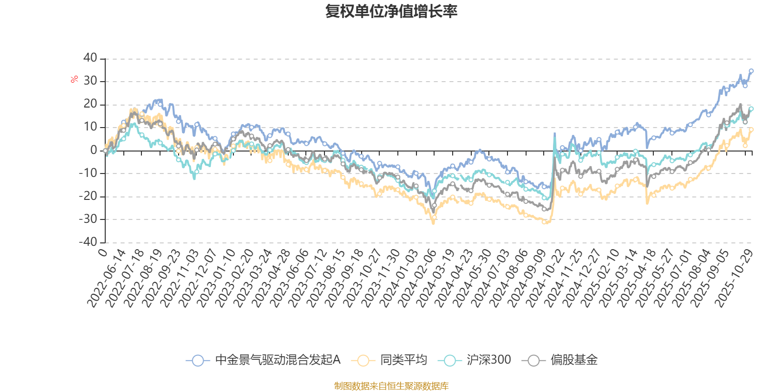 截至10月29日,中金景气驱动混合发起A近三个月复权单位净值增长率为14.43%,位于同类可比基金309/621;近半年复权单位净值增长率为27.40%,位于同类可比基金362/621;近一年复权单位净值增长率为33.49%,位于同类可比基金273/611;近三年复权单位净值增长率为26.55%,位于同类可比基金210/518。