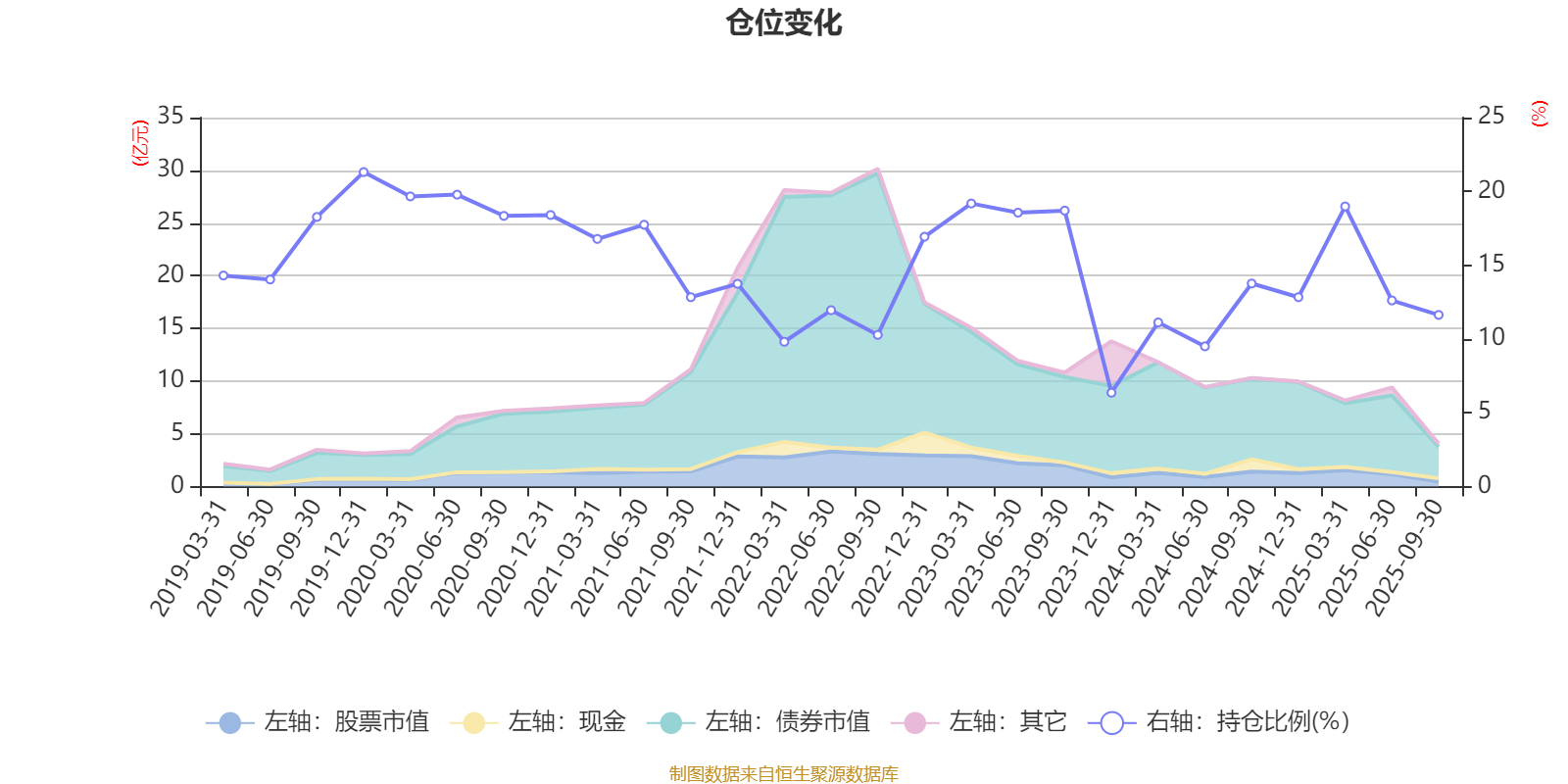 据定期报告数据统计,近三年平均股票仓位为14.18%,同类平均为19.14%。2019年末基金达到21.31%的最高仓位,2023年末最低,为6.36%。