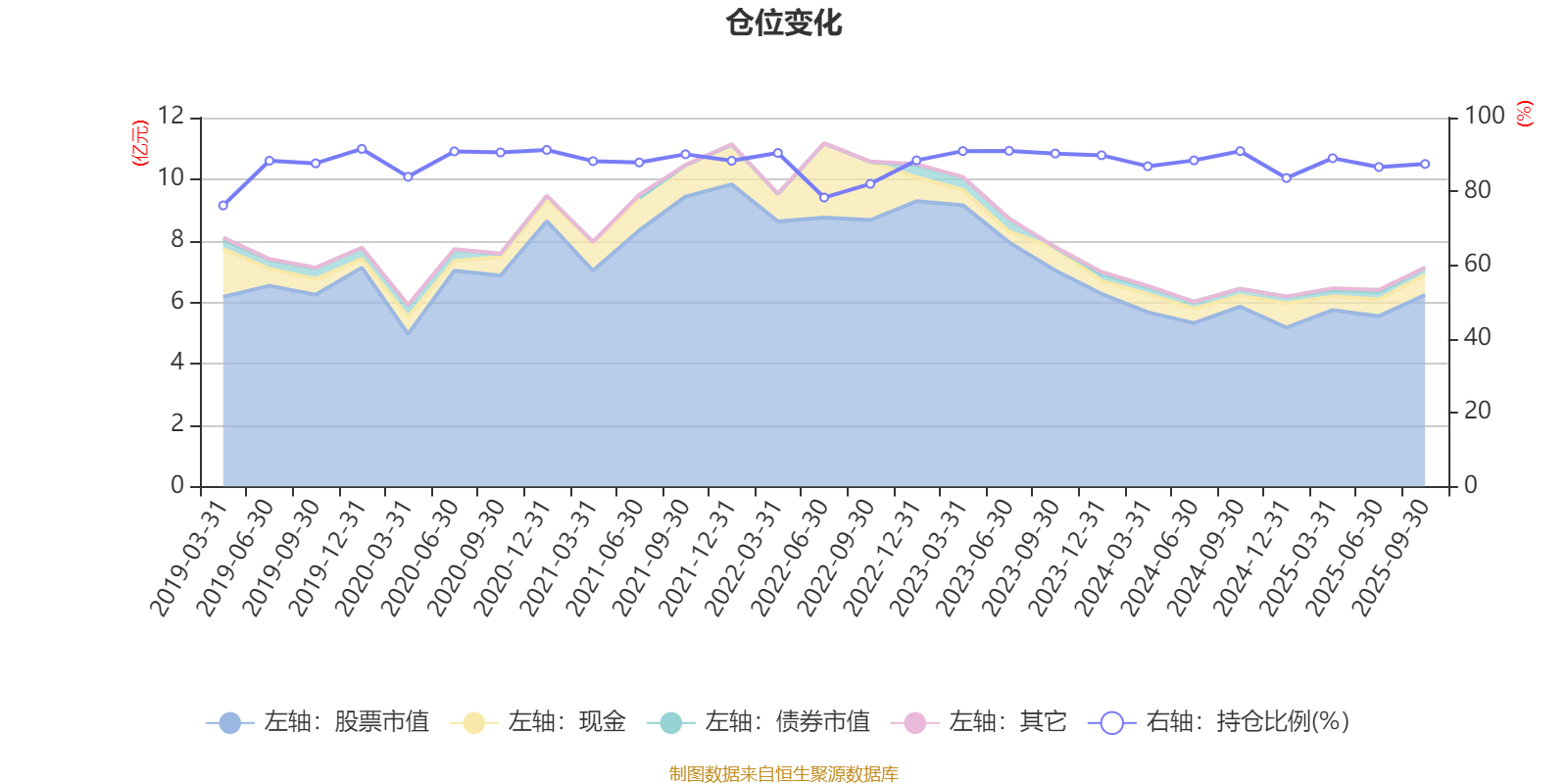 据定期报告数据统计,近三年平均股票仓位为88.6%,同类平均为72.35%。2019年末基金达到91.52%的最高仓位,2019年一季度末最低,为76.19%。