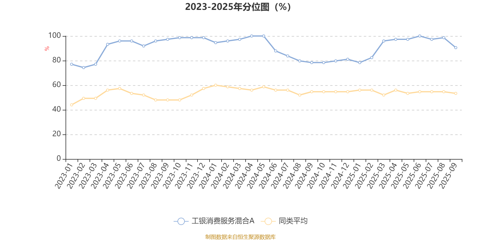 通过所选区间该基金净值增长率分位图,可以观察该基金与同类基金业绩比较情况。图为坐标原点到区间内某时点的净值增长率在同类基金中的分位数。