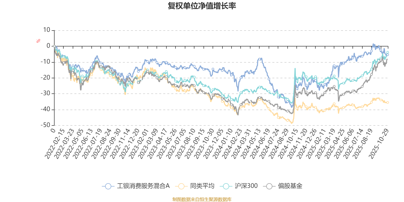 截至10月29日,工银消费服务混合A近三个月复权单位净值增长率为-1.36%,位于同类可比基金65/85;近半年复权单位净值增长率为6.45%,位于同类可比基金31/85;近一年复权单位净值增长率为24.24%,位于同类可比基金6/82;近三年复权单位净值增长率为22.32%,位于同类可比基金12/74。