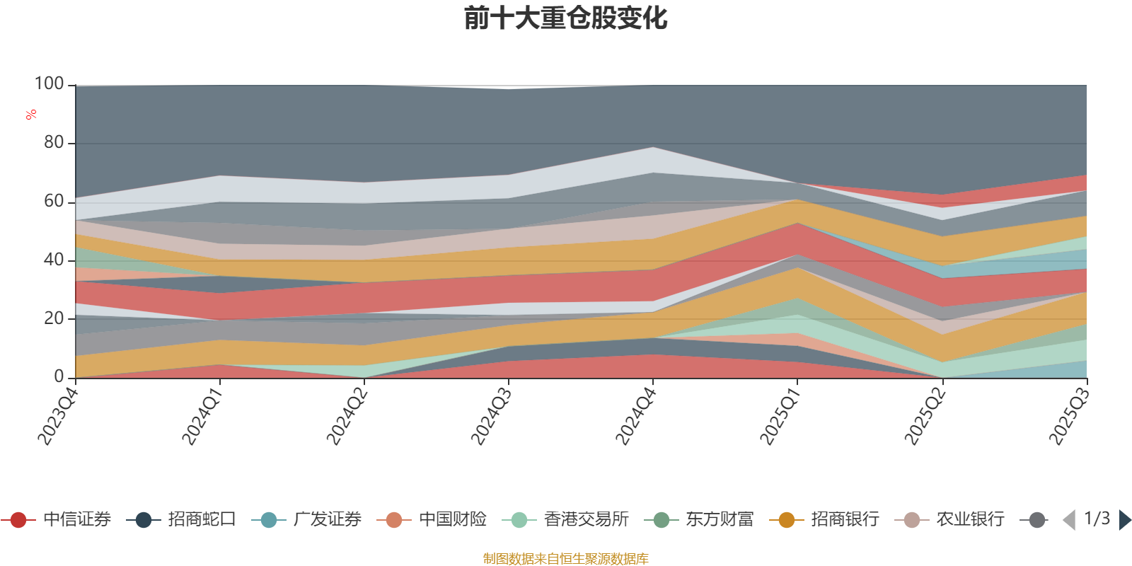 该基金持股集中度较高,近2年前十大重仓股集中度长期超过60%。截至2025年三季度末,基金十大重仓股分别是招商银行、中国太保、成都银行、香港交易所、杭州银行、汇丰控股、广发证券、东方财富、华润置地、中金公司。