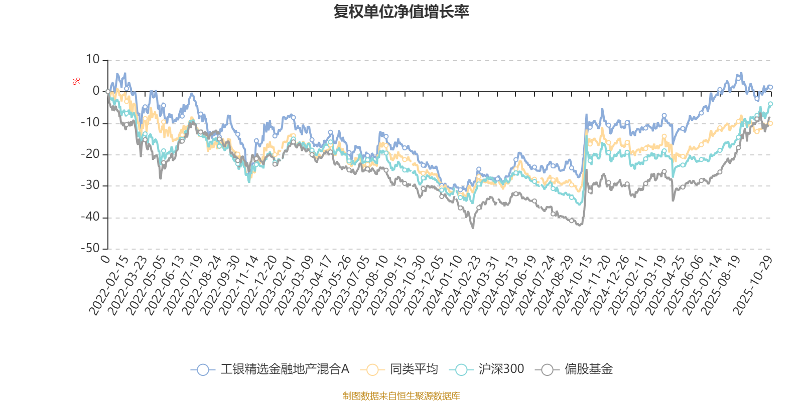 截至10月29日,工银精选金融地产混合A近三个月复权单位净值增长率为-1.52%,位于同类可比基金11/16;近半年复权单位净值增长率为15.66%,位于同类可比基金8/16;近一年复权单位净值增长率为13.47%,位于同类可比基金5/14;近三年复权单位净值增长率为35.09%,位于同类可比基金8/12。