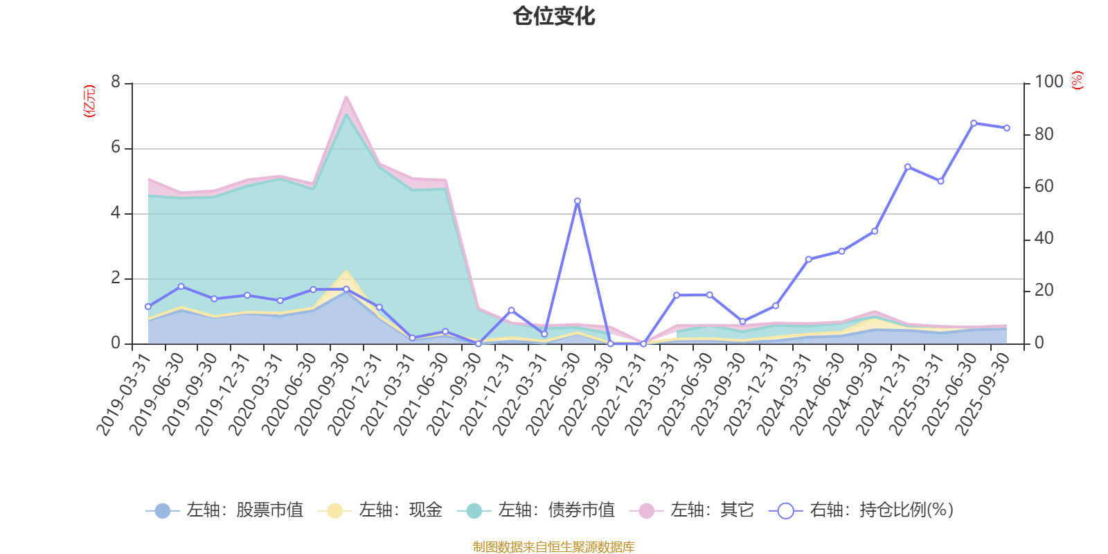 据定期报告数据统计,近三年平均股票仓位为39.13%,同类平均为72.35%。2025年上半年末基金达到84.64%的最高仓位,2021年三季度末最低,为0.03%。