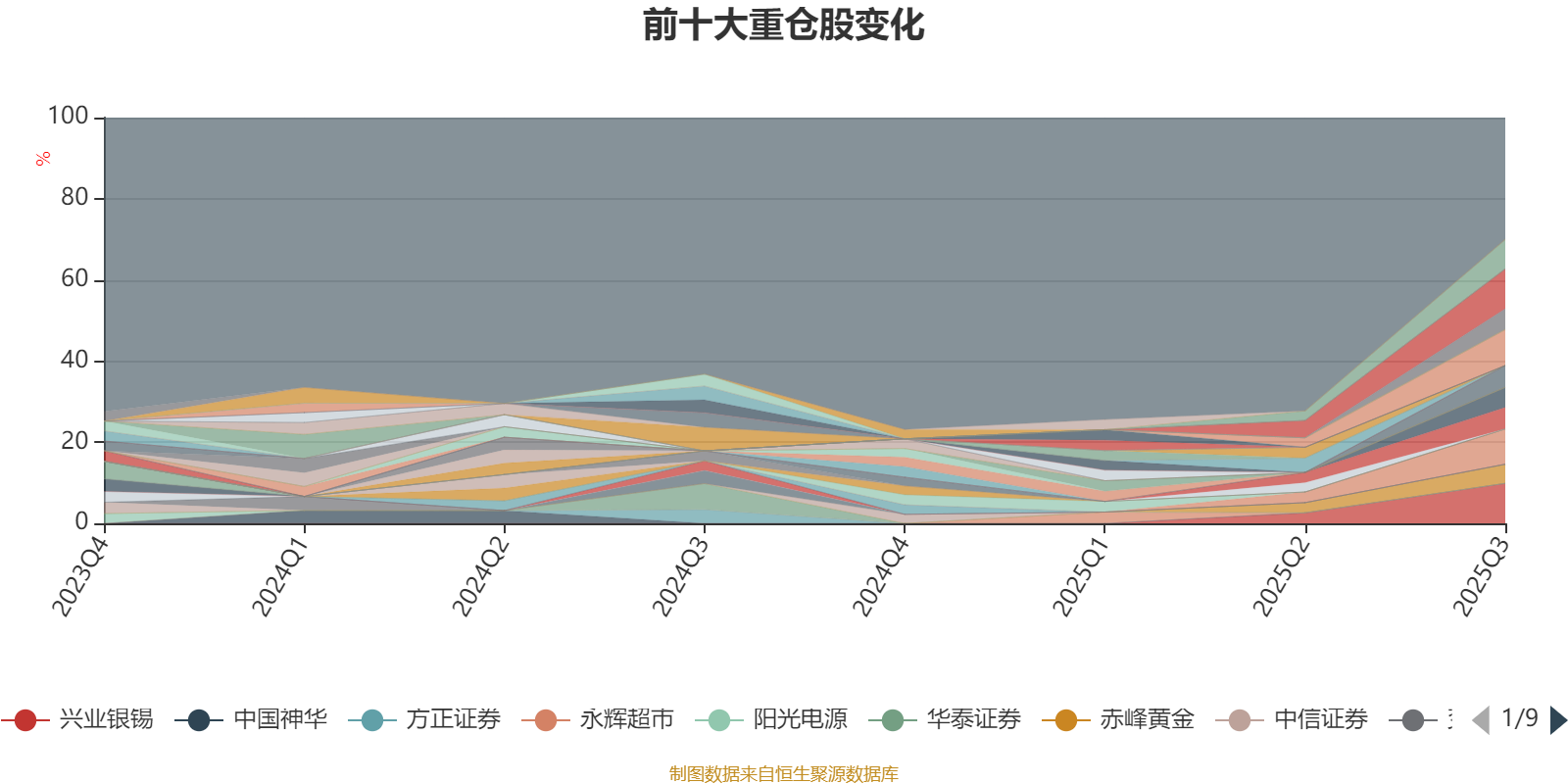 截至2025年三季度末,基金十大重仓股分别是中国稀土、兴业银锡、盛和资源、广晟有色、华友钴业、铜陵有色、盛达资源、北方稀土、湖南白银、赤峰黄金。