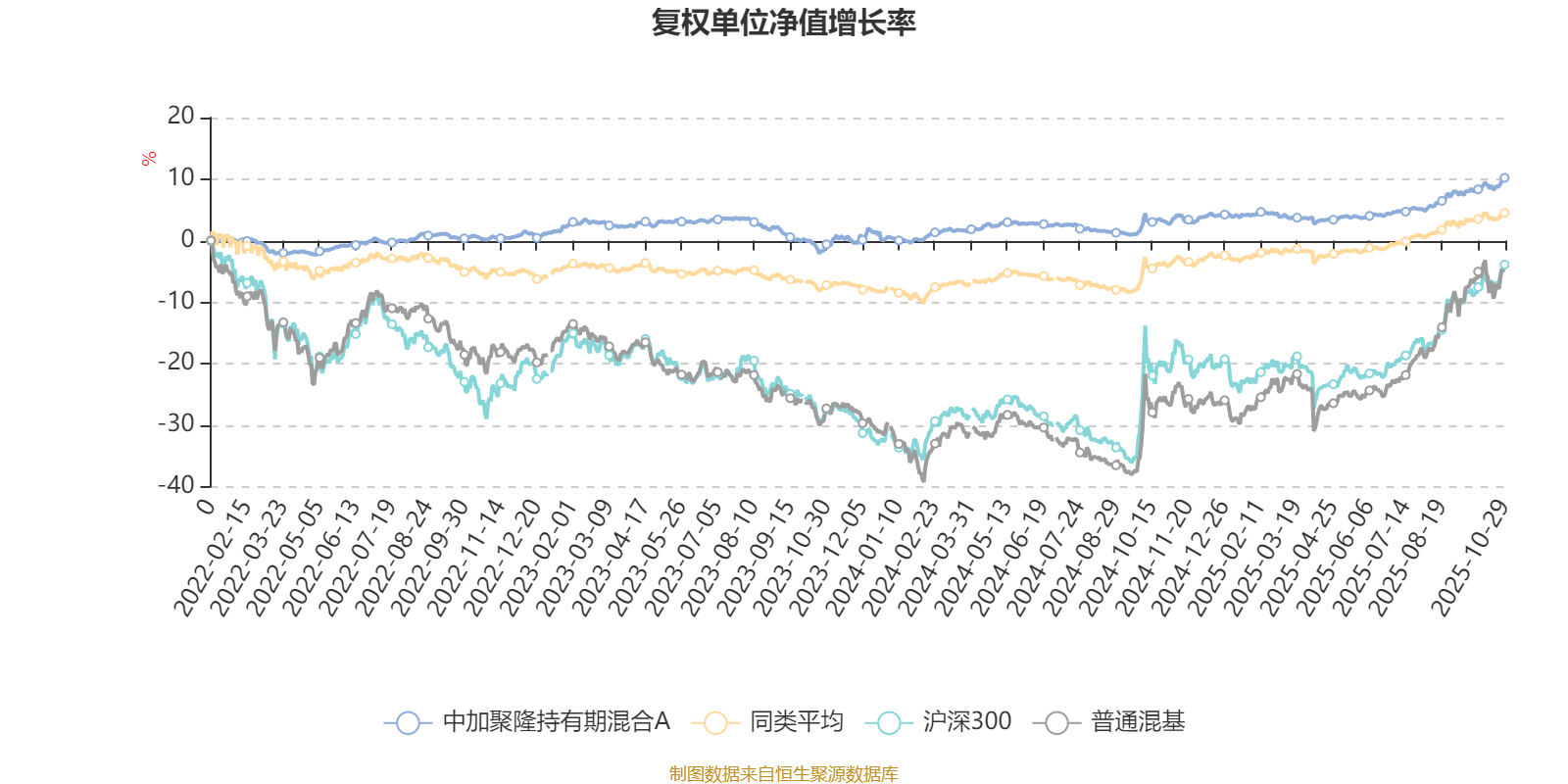 截至10月29日,中加聚隆持有期混合A近三个月复权单位净值增长率为4.86%,位于同类可比基金127/629;近半年复权单位净值增长率为6.53%,位于同类可比基金251/629;近一年复权单位净值增长率为7.01%,位于同类可比基金349/623;近三年复权单位净值增长率为10.05%,位于同类可比基金358/557。