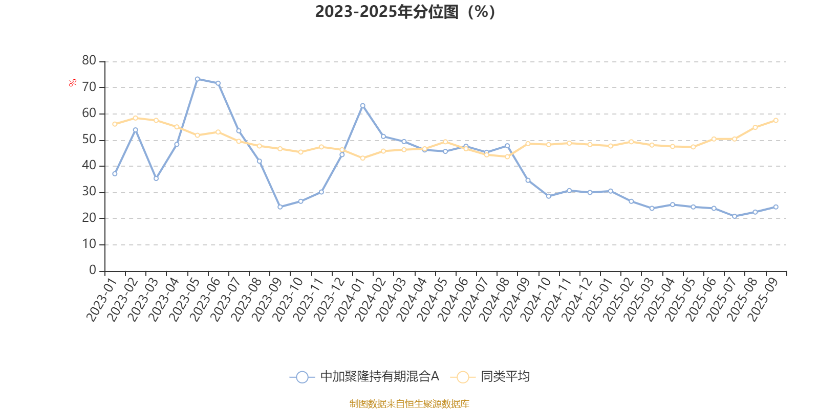 通过所选区间该基金净值增长率分位图,可以观察该基金与同类基金业绩比较情况。图为坐标原点到区间内某时点的净值增长率在同类基金中的分位数。