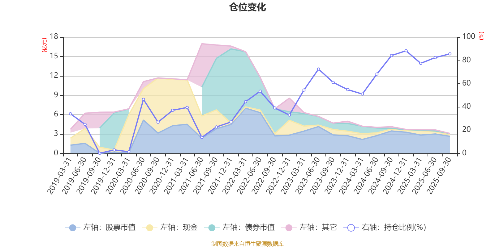 据定期报告数据统计,近三年平均股票仓位为67.69%,同类平均为72.35%。2024年末基金达到88.19%的最高仓位,2019年三季度末最低,为0%。