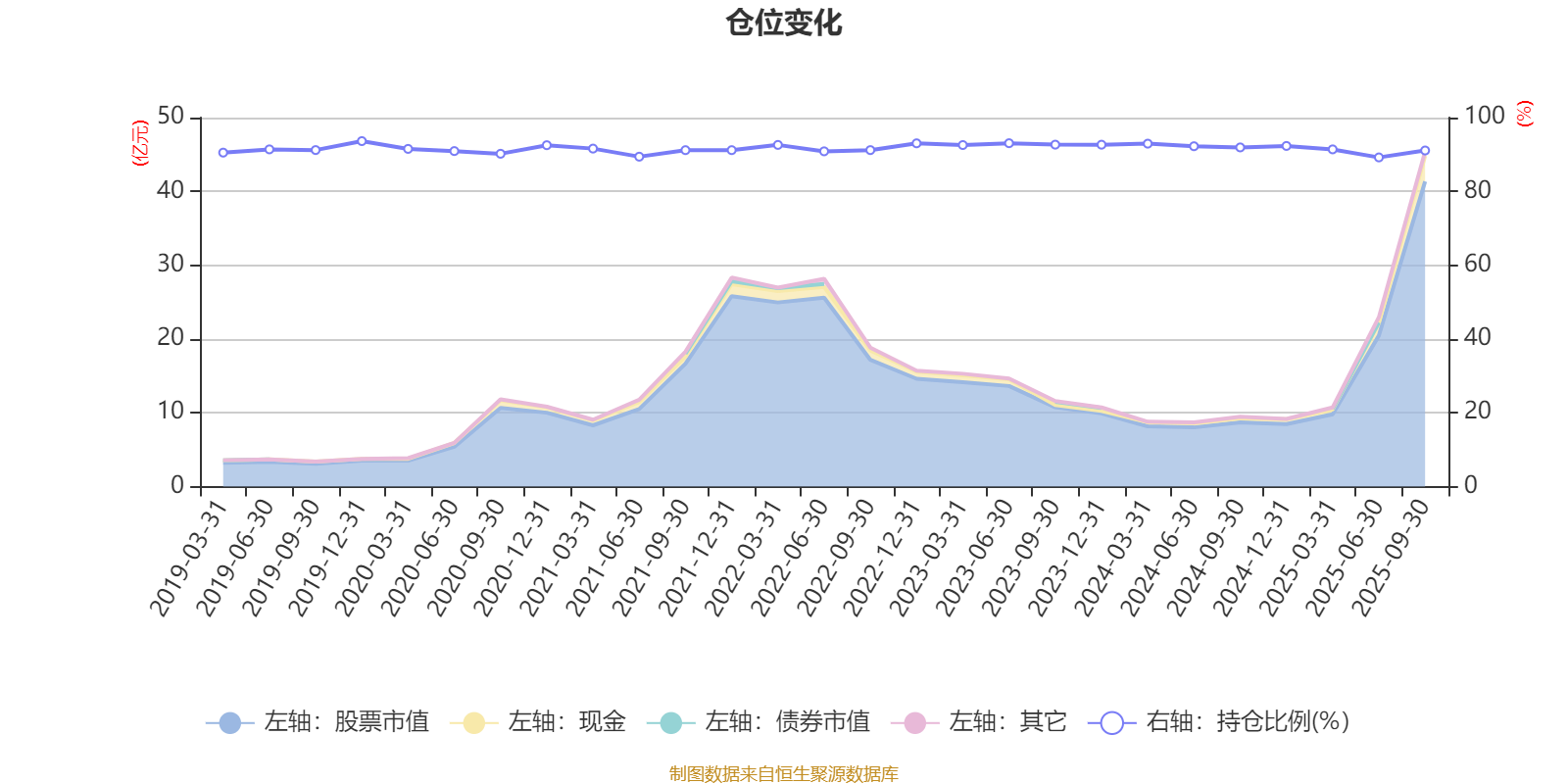 据定期报告数据统计,近三年平均股票仓位为92.09%,同类平均为72.35%。2019年末基金达到93.63%的最高仓位,2025年上半年末最低,为89.21%。
