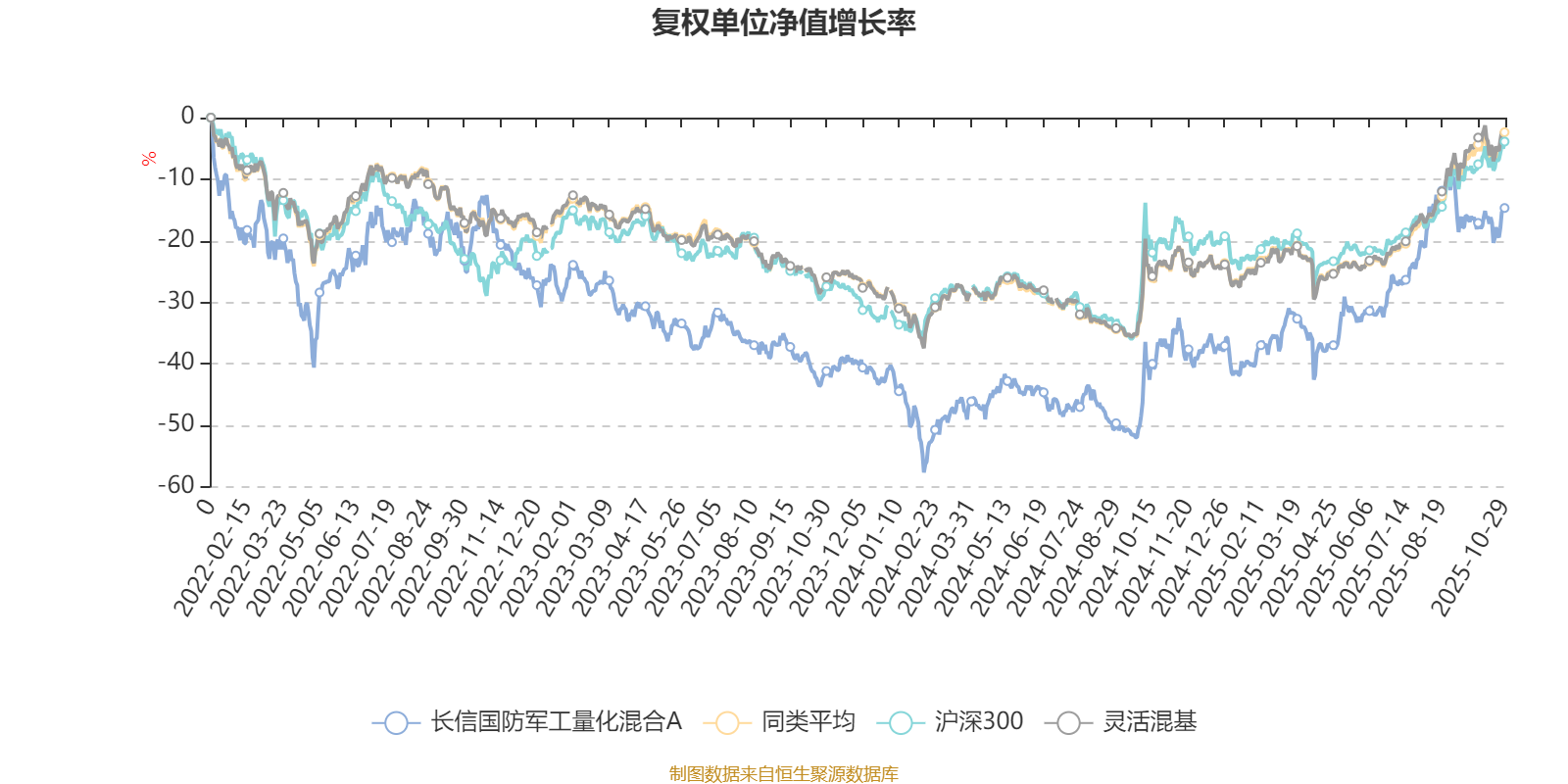 截至10月29日,长信国防军工量化混合A近三个月复权单位净值增长率为6.66%,位于同类可比基金864/1287;近半年复权单位净值增长率为36.05%,位于同类可比基金387/1287;近一年复权单位净值增长率为36.10%,位于同类可比基金356/1287;近三年复权单位净值增长率为-0.70%,位于同类可比基金1051/1286。