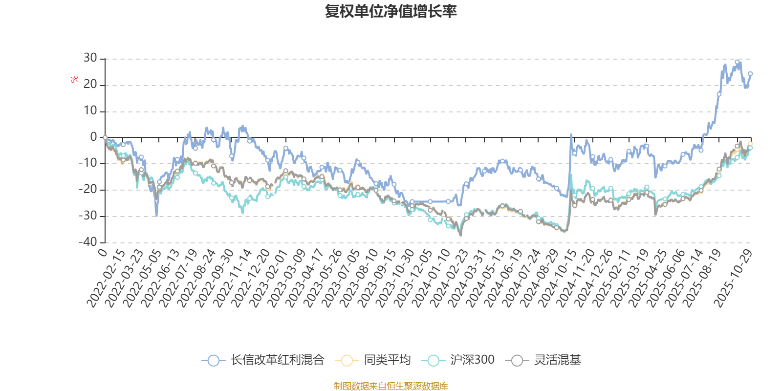 截至10月29日,长信改革红利混合近三个月复权单位净值增长率为17.37%,位于同类可比基金446/1287;近半年复权单位净值增长率为38.21%,位于同类可比基金335/1287;近一年复权单位净值增长率为30.79%,位于同类可比基金477/1287;近三年复权单位净值增长率为21.70%,位于同类可比基金554/1286。