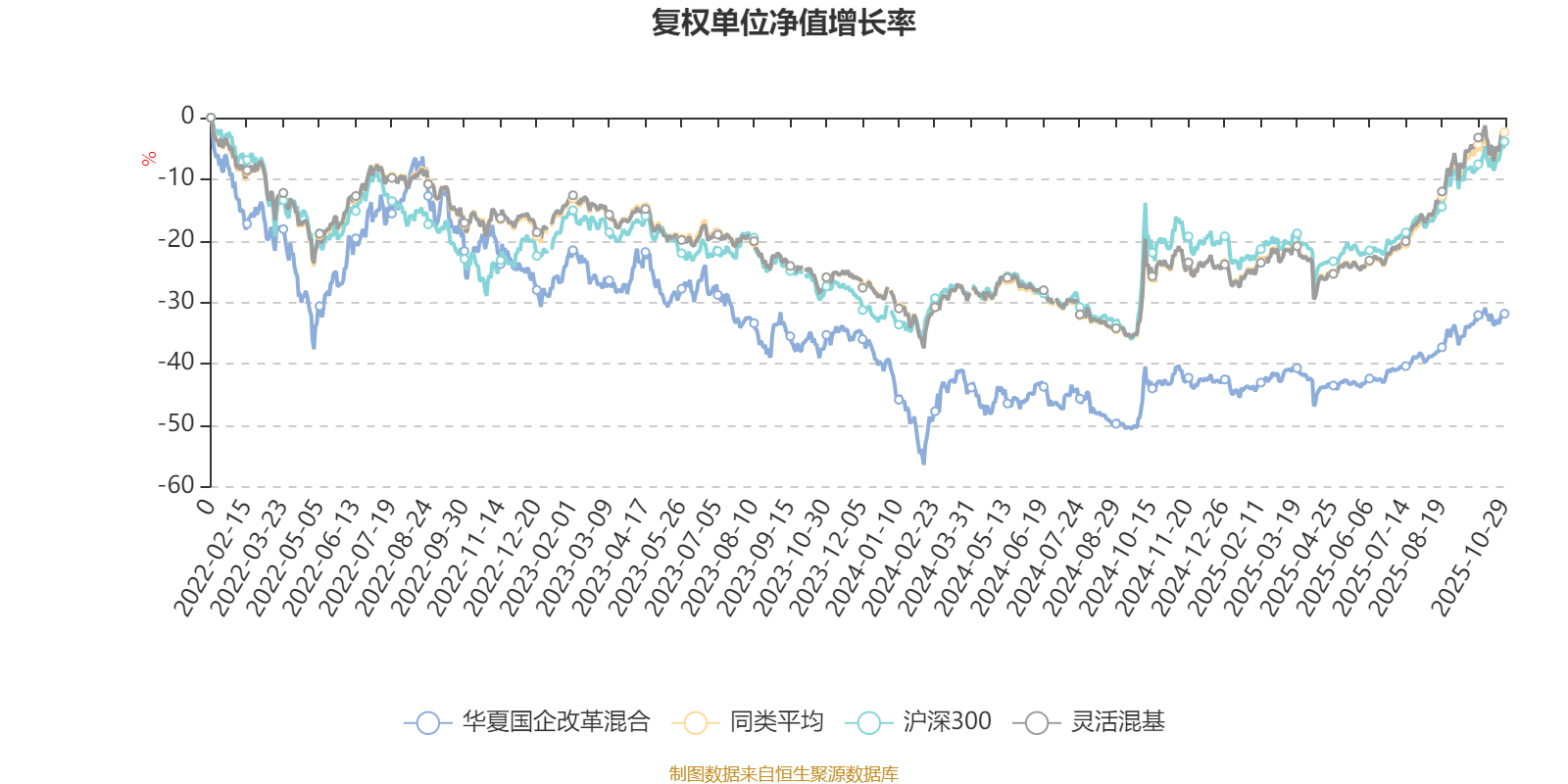 截至10月29日,华夏国企改革混合近三个月复权单位净值增长率为10.55%,位于同类可比基金715/1287;近半年复权单位净值增长率为21.41%,位于同类可比基金745/1287;近一年复权单位净值增长率为19.70%,位于同类可比基金750/1287;近三年复权单位净值增长率为-13.36%,位于同类可比基金1190/1286。