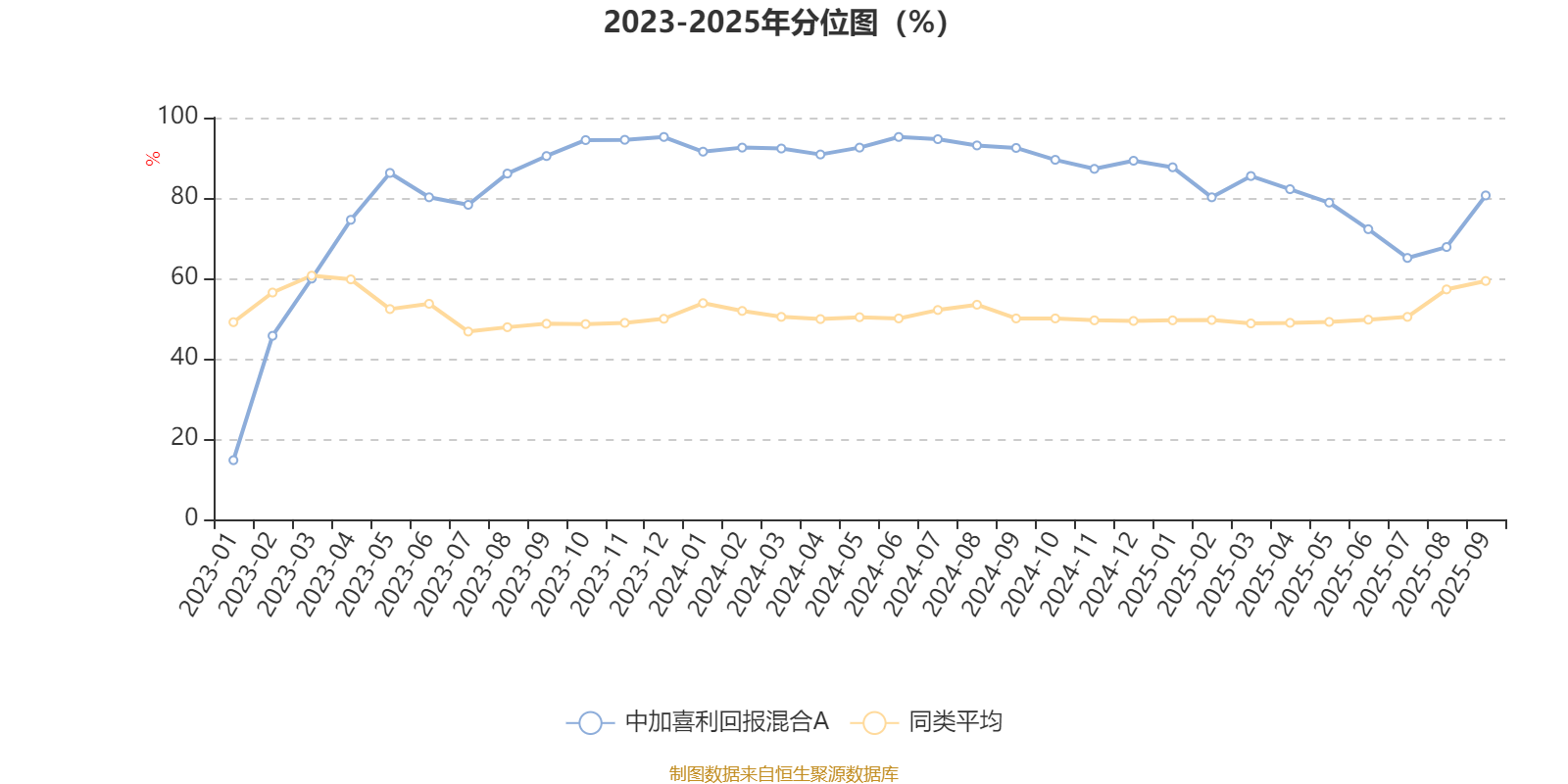 通过所选区间该基金净值增长率分位图,可以观察该基金与同类基金业绩比较情况。图为坐标原点到区间内某时点的净值增长率在同类基金中的分位数。