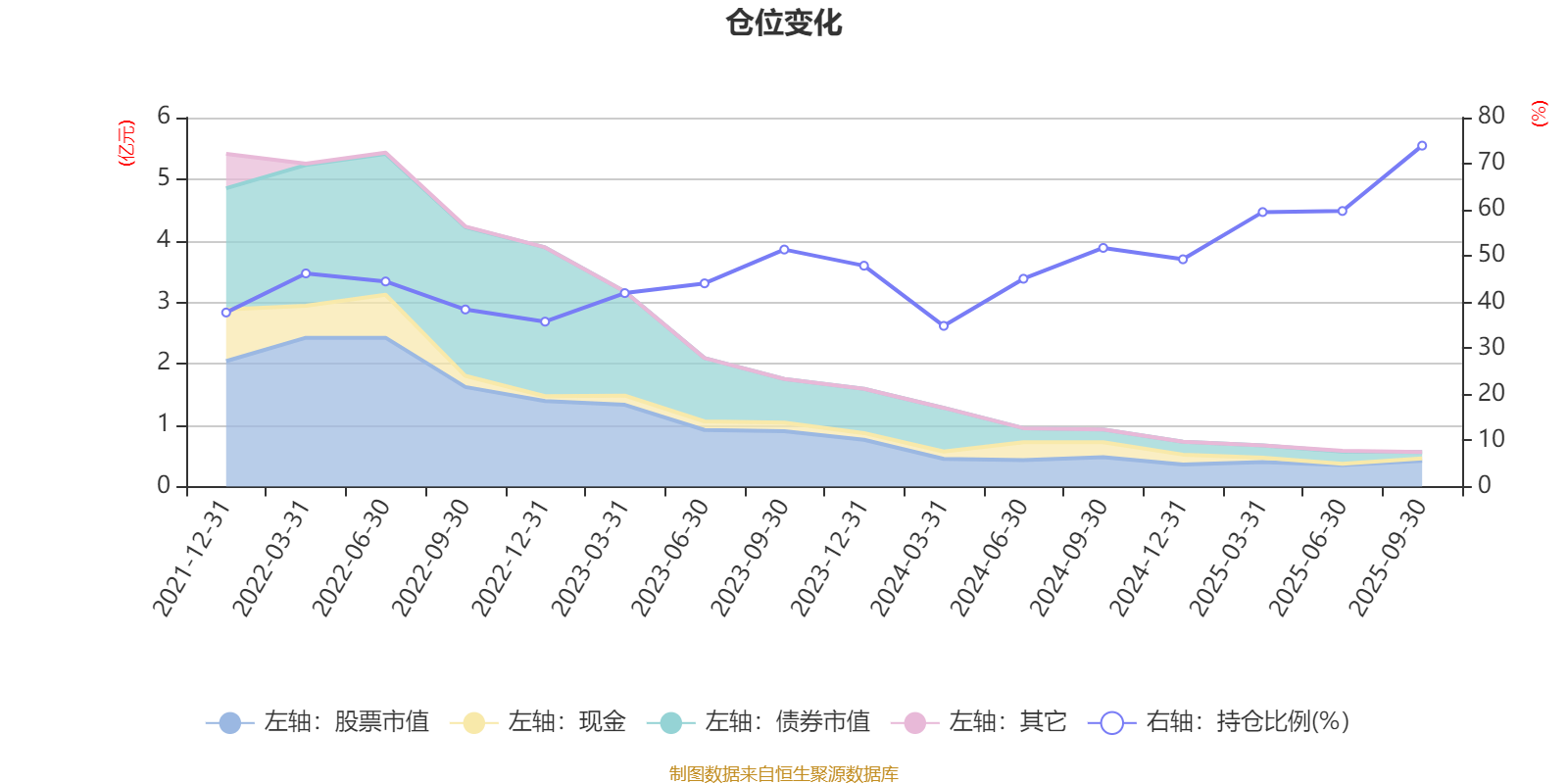 据定期报告数据统计,近三年平均股票仓位为49.6%,同类平均为72.35%。2025年三季度末基金达到73.92%的最高仓位,2024年一季度末最低,为34.84%。