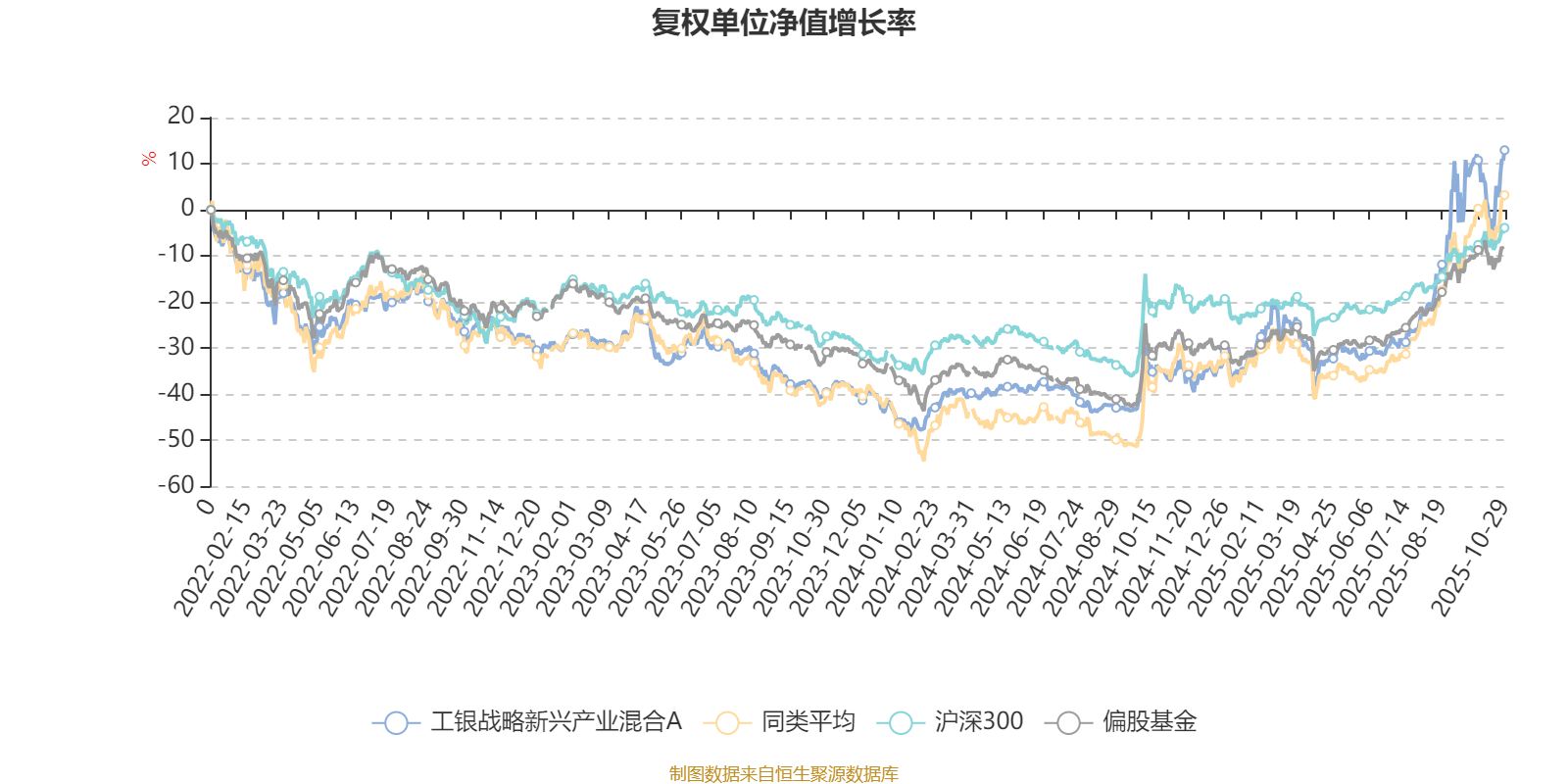 截至10月29日,工银战略新兴产业混合A近三个月复权单位净值增长率为46.28%,位于同类可比基金55/229;近半年复权单位净值增长率为64.52%,位于同类可比基金84/229;近一年复权单位净值增长率为76.36%,位于同类可比基金50/213;近三年复权单位净值增长率为50.15%,位于同类可比基金79/158。