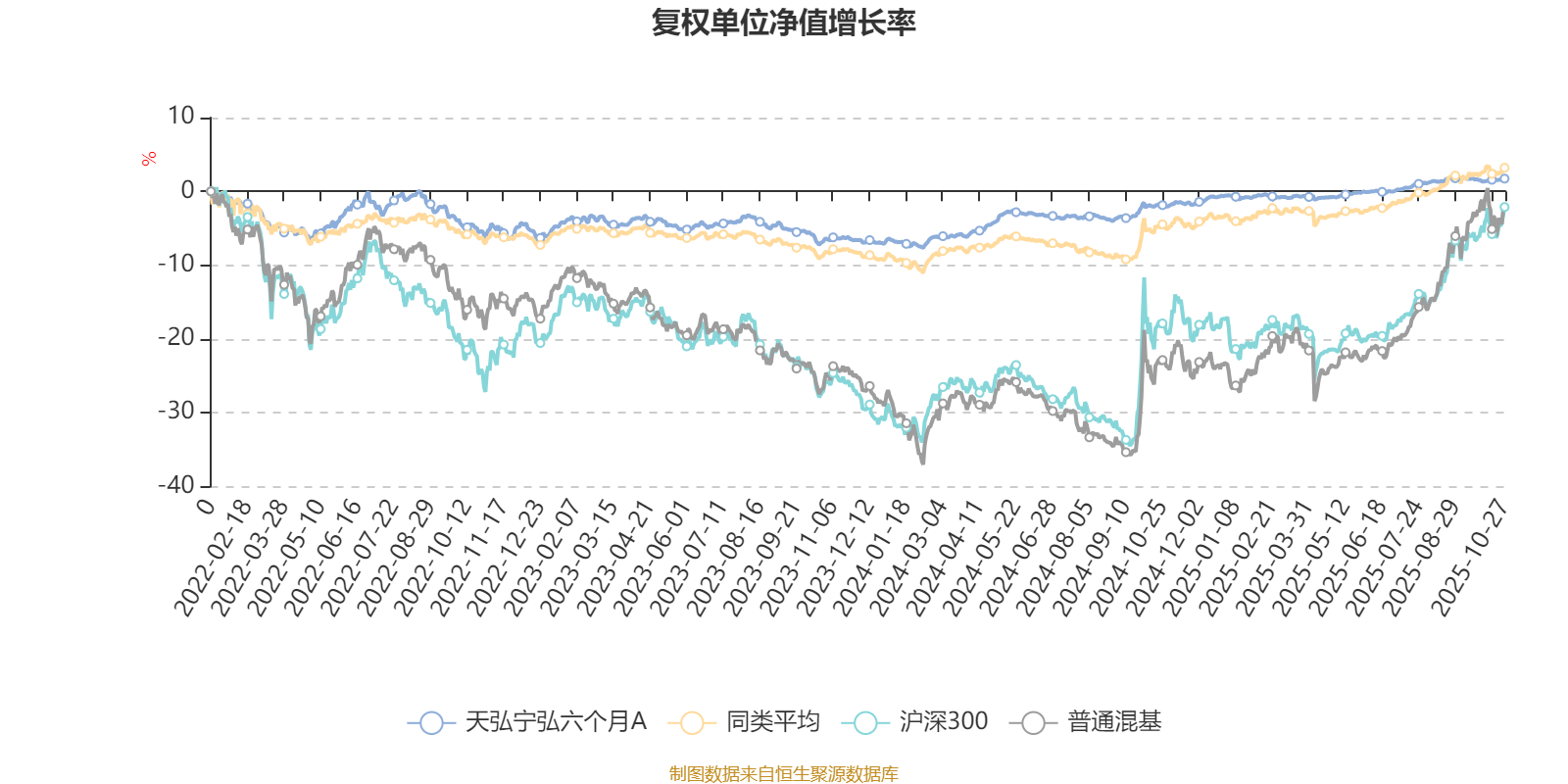 截至10月27日,天弘宁弘六个月A近三个月复权单位净值增长率为0.67%,位于同类可比基金552/629;近半年复权单位净值增长率为2.52%,位于同类可比基金542/629;近一年复权单位净值增长率为3.65%,位于同类可比基金537/623;近三年复权单位净值增长率为7.56%,位于同类可比基金412/557。