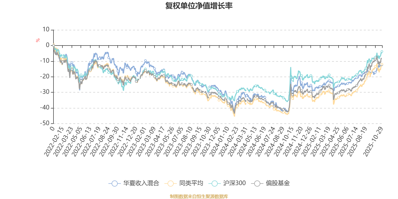 截至10月29日,华夏收入混合近三个月复权单位净值增长率为8.31%,位于同类可比基金141/185;近半年复权单位净值增长率为18.74%,位于同类可比基金147/185;近一年复权单位净值增长率为18.23%,位于同类可比基金139/181;近三年复权单位净值增长率为6.45%,位于同类可比基金142/175。