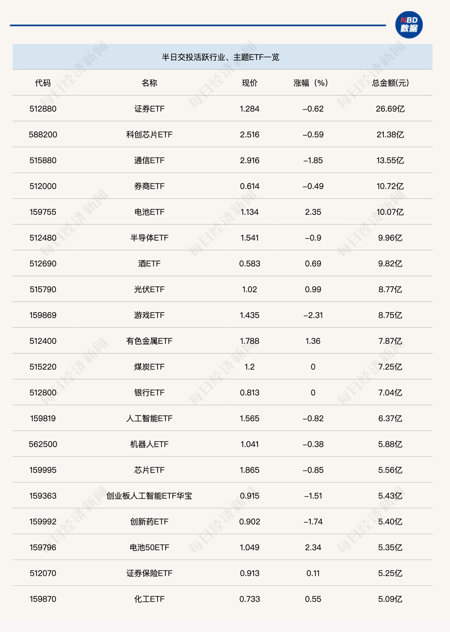 今日上午,证券ETF(512880)和香港证券ETF(513090)持续保持交易热度,成交金额较大。其中,香港证券ETF(513090)半日成交金额达到89.44亿元。行业、主题类ETF方面,除了证券ETF(512880),电池ETF和半导体ETF交投相对活跃,半日成交金额在10亿元左右;科创芯片ETF(588200)半日成交达到21.38亿元。